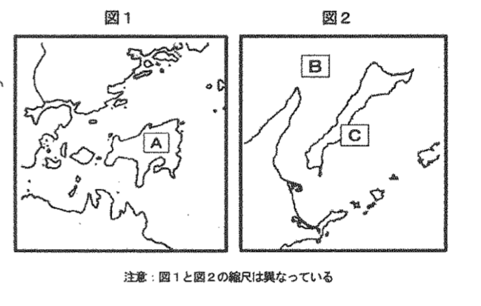 - 問2 C島の形から国後島と判別し、そこからBがオホーツク海であることを特定したい。根室の位置がわかっていれば、そこから地域を特定できる。各地域の特産品もおさえておきたい。