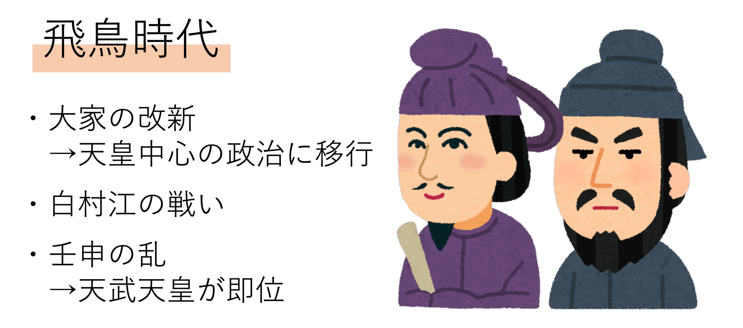 ではここから飛鳥時代の解説に移り,戦乱を本格的に見ていきましょう。まず飛鳥時代の初め頃,蘇我氏というグループが朝廷と近づき勢力を強めていきます。この蘇我氏が,聖徳太子が亡くなった後の政治を握ろうとしたのですが,これに対し中大兄皇子・中臣鎌足らが天皇中心の政治を取り戻すために実行した改革が大化の改新です。厳密に言えばこの大化の改新とは改革そのものを指すため,戦乱とは言えません。しかしその一部である乙巳の変(いっしのへん)と呼ばれるクーデターで蘇我氏の有力者である蘇我入鹿の首がはねられたことは登場してもおかしくありません。そのため戦乱の文脈で頭に入れておくといいでしょう。