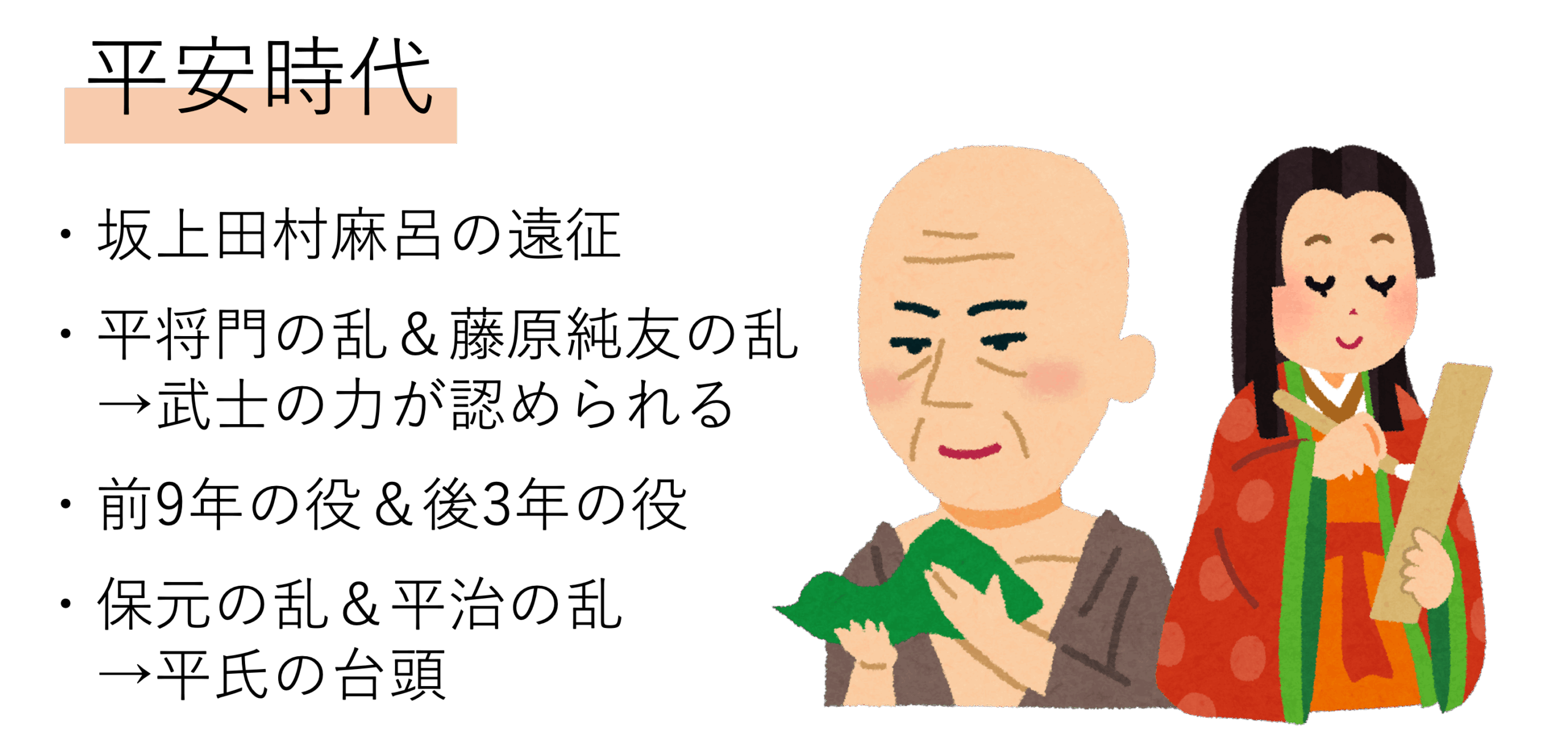 ここからは平安時代の歴史を辿っていくこととします。先の章でも触れましたが,平安時代は桓武天皇が都を平安京へと移した794年を基準にスタートします。その400年間の歴史の中では多くのことが変わったのですが,戦乱に関してまず覚えておきたいことは坂上田村麻呂の遠征です。彼は桓武天皇によって征夷大将軍という役職に任命され,東北地方に住んでいた蝦夷という人々を支配しようとしました。この坂上田村麻呂に関しては多くの伝説が残されていますので,具体的な戦いの名前こそ覚える必要はないものの,その名前はしっかり暗記しておきましょう。