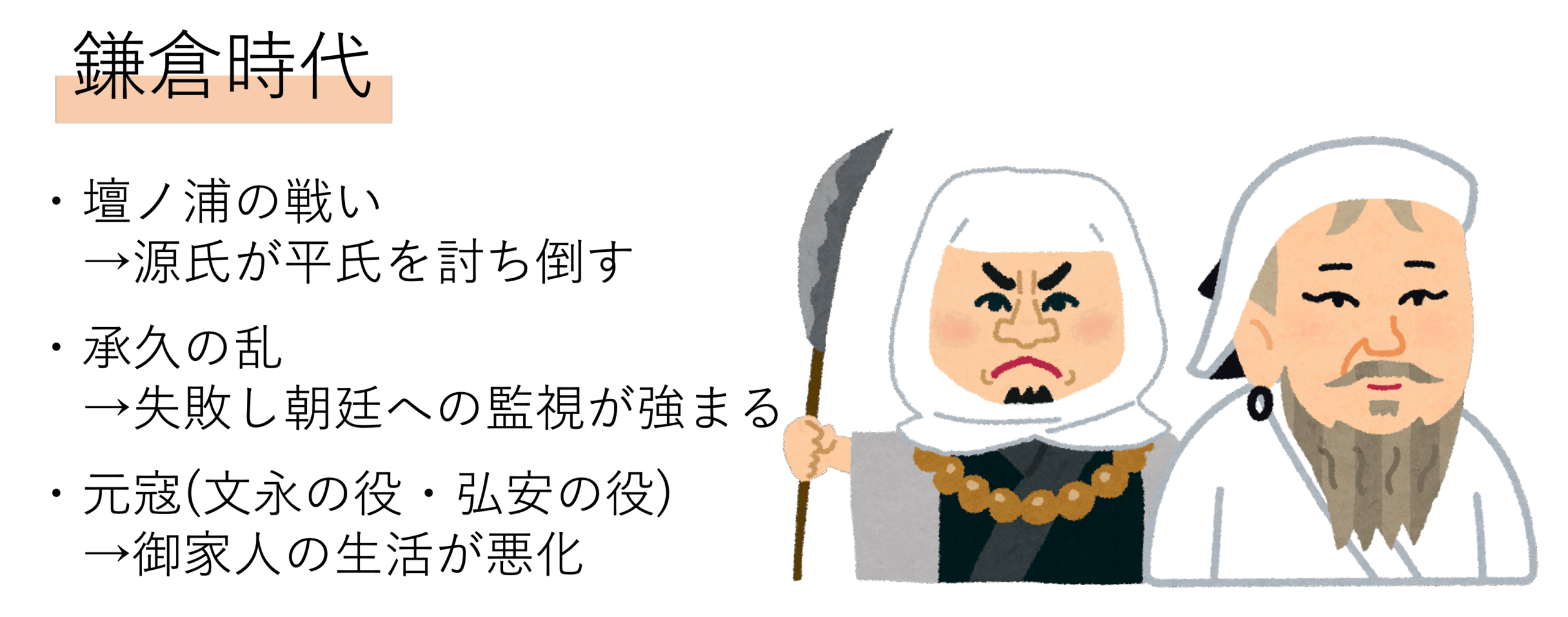 そして鎌倉時代の締めとして解説するのが元寇です。鎌倉時代の終わり頃,現在の中国を支配していた元という国が日本に服属を求めます。当然幕府の執権であった北条時宗はこれを阻止するのですが,その結果元は2度にわたって日本に攻め入りました。この2度の戦いのうち1274年に起きたものを文永の役,1281年に起きたものを弘安の役と呼びます。この戦いにおいてフビライ=ハン率いる元はてつはうなどの火器を使ってきたため日本は大変苦戦するのですが,石塁という土手による強固な防衛と相次ぐ悪天候によって現行は退き,幕府は日本を守ることに成功しました。しかしこの戦いは防戦だったので,新たに土地を得ることはできませんでした。そうなると,奉公してくれた武士に対して支払う土地という報償が支払えません。その結果たくさんの御家人の生活が苦しくなり,社会が混乱してしまうのでした。