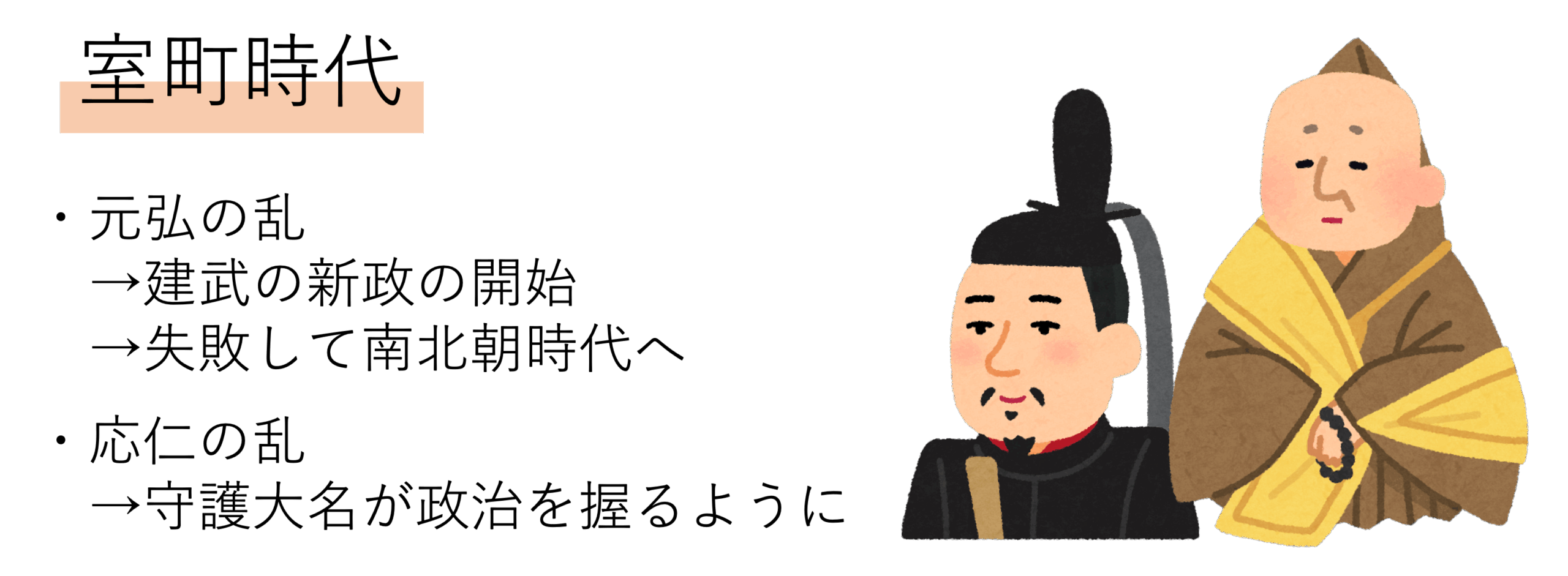 ここからは室町時代の戦乱史に移ります。先ほど説明した元寇より御家人の生活が苦しくなると,鎌倉幕府に対する不満が高まっていきます。室町時代では,まず初めにそれをチャンスと捉えた後醍醐天皇が,1324年に倒幕を図って戦いを起こします。これが正中の変です。この戦乱の名前が受験に出ることはないでしょうが,天皇の名前は覚えておくと良いでしょう。この正中の変は結局失敗に終わってしまうのですが,その後有力な武士である足利尊氏・新田義貞・楠木正成などが天皇に味方し,1333年に元弘の乱を起こすと,今度は無事成功し,約150年続いた鎌倉幕府を滅ぼすことになりました。