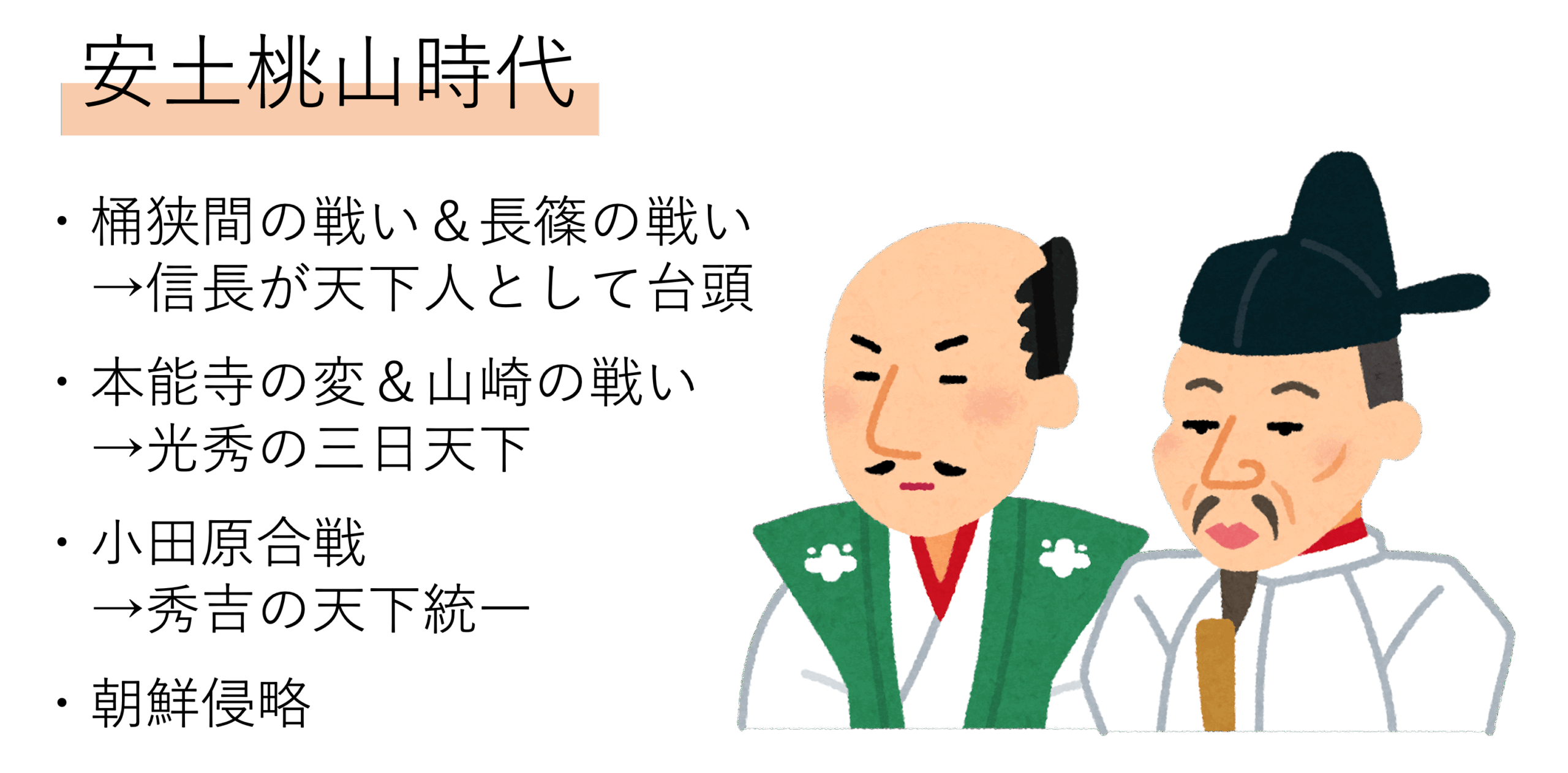 最後に安土桃山時代について確認していきます。室町時代の終わりになると大名が政治の中心に立つようになり,やがて身分の低いものが身分の高いものを倒す下克上の風潮が強まっていきました。そんな安土桃山時代には全国各地で戦国大名の間に多数の戦乱が起こります。今回はその中でも重要なものをピックアップして確認していきましょう。