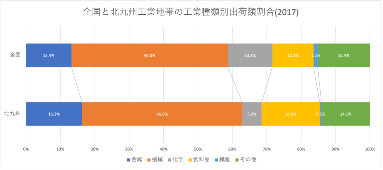 まず大きな違いが生産額にあります。一番初めに乗せたグラフをしていただければわかるかと思いますが,阪神工業地帯は全国第2位の出荷額であるのに対し北九州工業地帯は全国第9位とかなり順位が離れています。