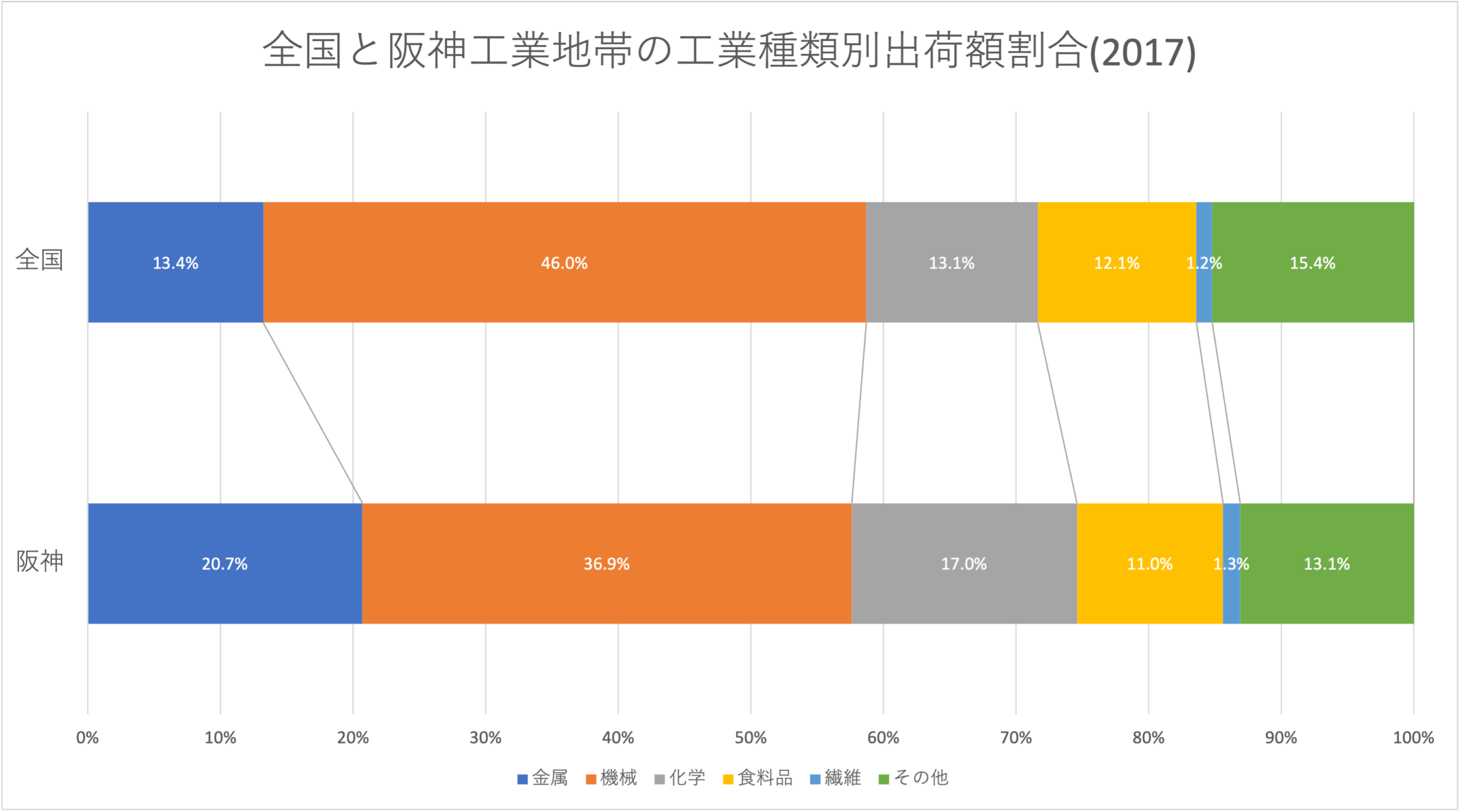では阪神工業地帯の産業の構成はどのようになっているのでしょうか。全国の割合と阪神の割合を比較するグラフを用意しましたので,そちらを参照しながら解説していきます。(データは教育出版株式会社とHelloSchool社会科からの引用です)。