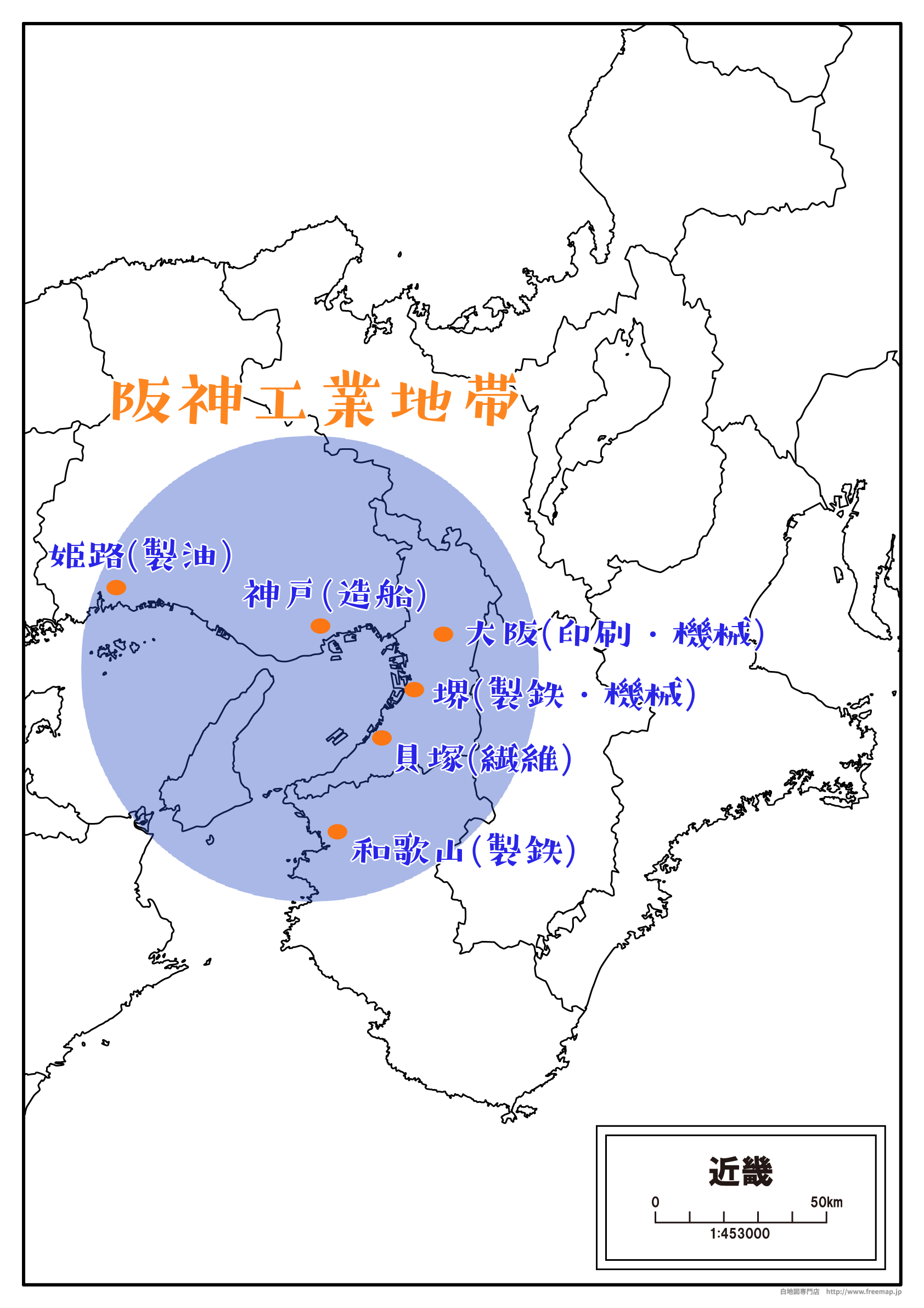 大雑把にいうと,次の図の青く塗られている部分が阪神工業地帯の区域になります。オレンジ色の点は代表的な都市を,()の中身はそこで栄えている産業を表します。ここで取り上げている都市・産業は,出来れば頭の中に入れておきましょう。