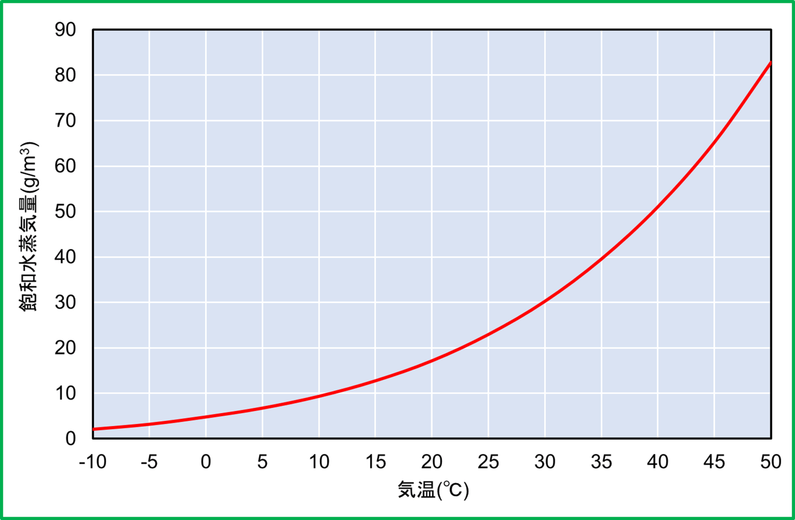 温度と飽和水蒸気量の関係を表したグラフがこちらです.