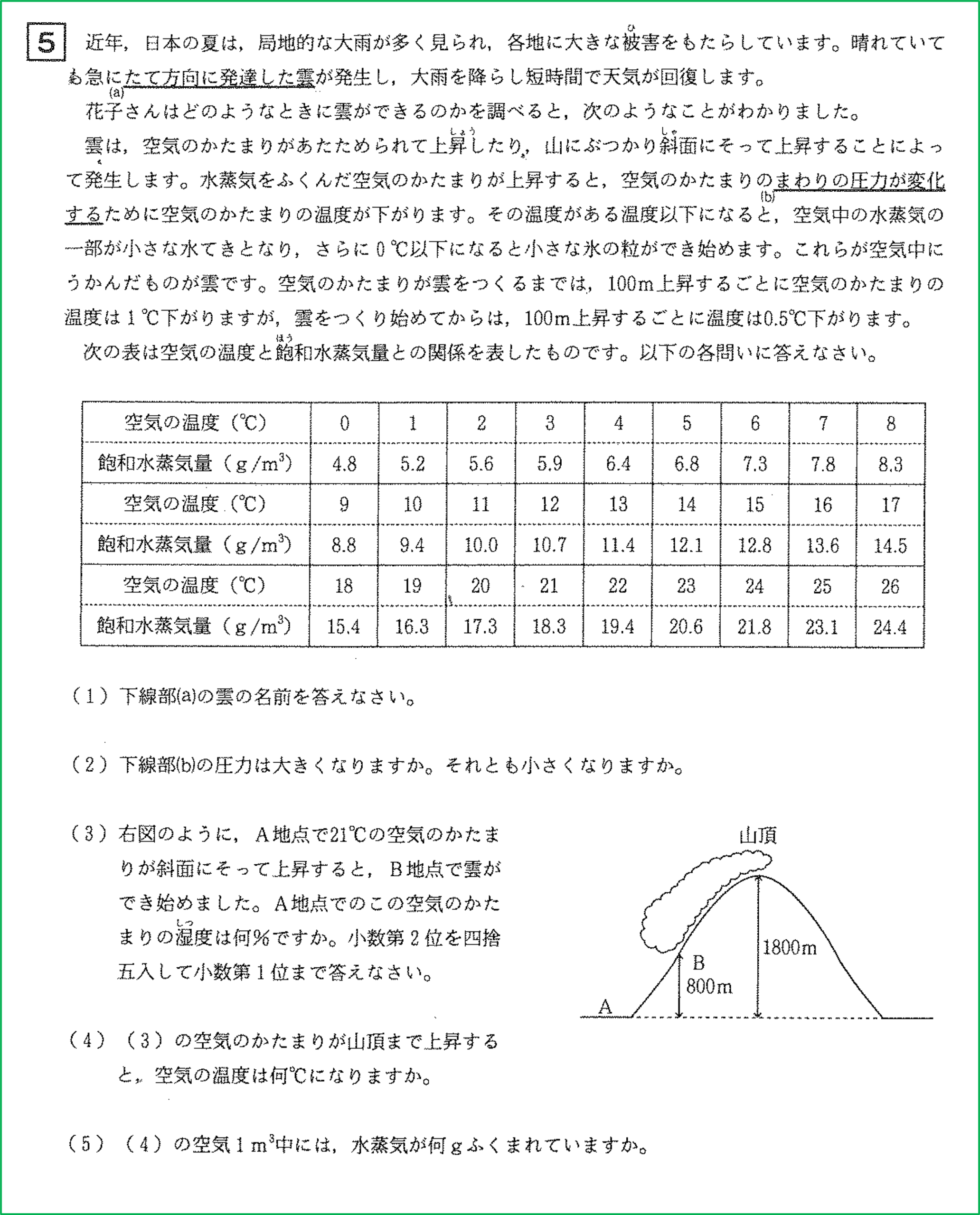 (4)より,山頂での空気のかたまりの温度は8 ℃なので,8 ℃の飽和水蒸気量は8.3 g/m3となり,つまり山頂において空気1m3あたりに含まれる水蒸気は8.3 gです.