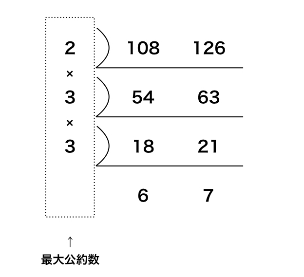 - (3) 108と126の公約数をすべて求めなさい。また,最大公約数はいくつですか。