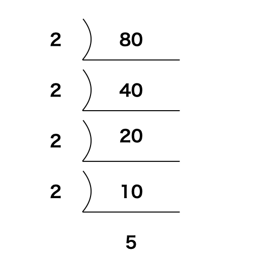 これより,80は2を4つふくむので,2で4回割り切ることができます。5は素数なので,5回目の割り算のときに商が小数になり,整数でなくなります。