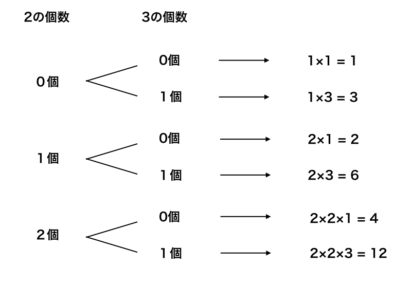 例えば,2が0個,3が1個のとき, 1 × 3 = 3
