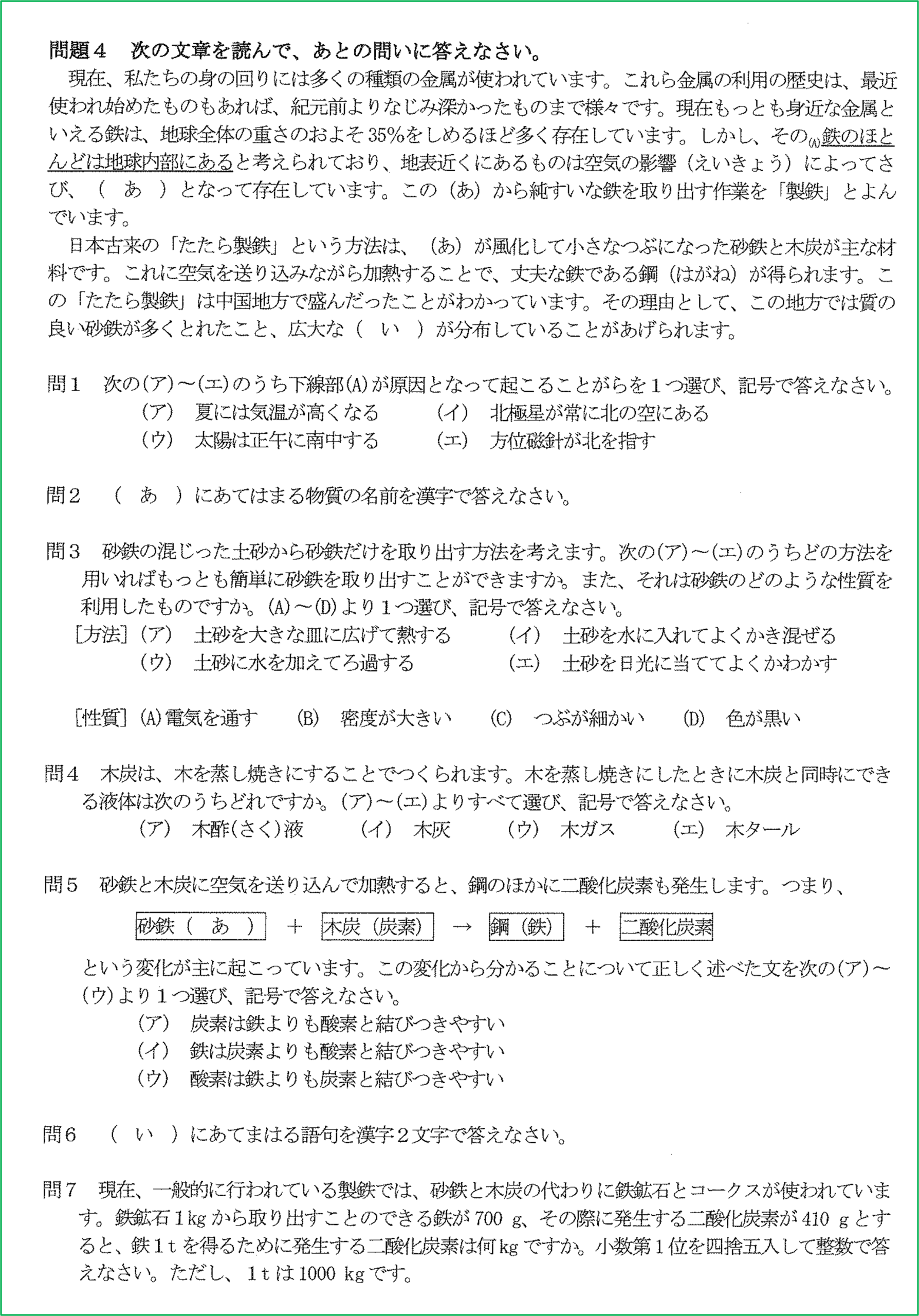 たたら製鉄に必要な材料は砂鉄と木炭であると問題文に書いてあります.