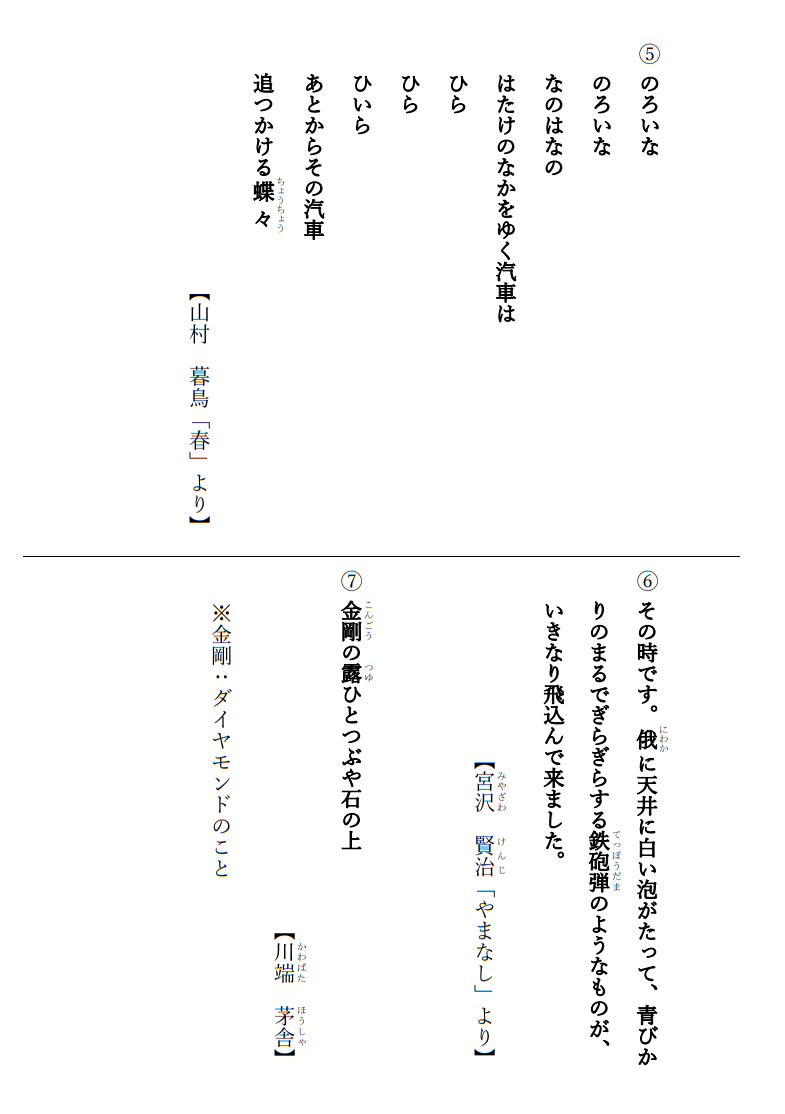 詩や短歌は表現技法がたくさん使われるので、まずどこかに今回説明したような表現がないか探してみてください。また小説や説明文の問題でも表現技法を見つけた場合はその効果を考えてみましょう。