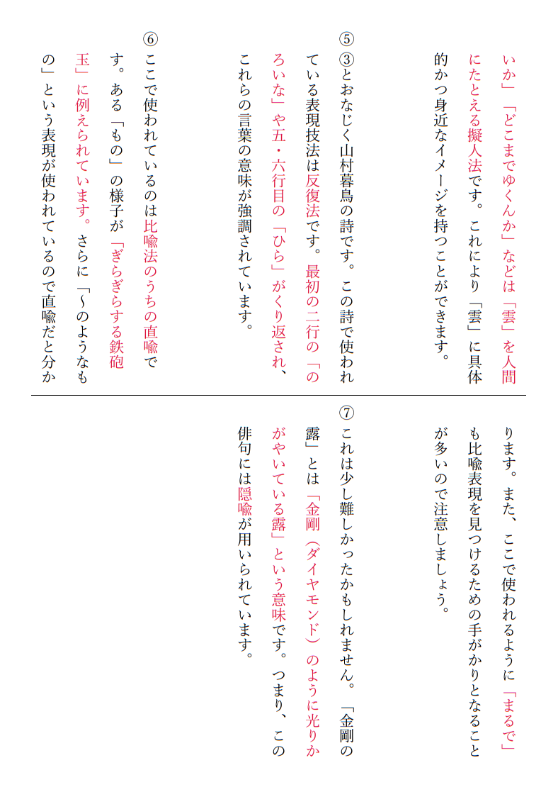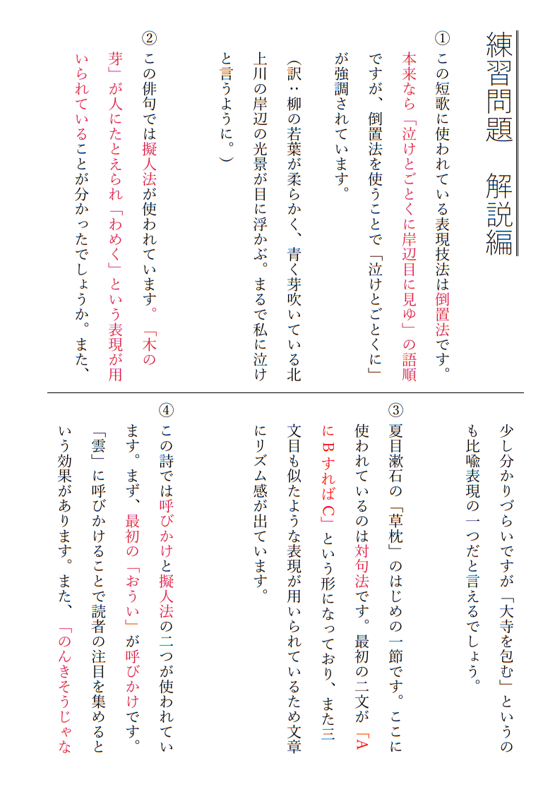 この記事では国語の問題で出てくる表現技法について説明しました。表現技法はそれ自体が問題になることは少ないですが、文章や詩を読む際に正しく内容を理解するヒントになります。