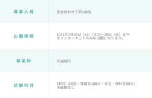 国語の試験時間は50分、100点満点であり、4教科合計の満点は300点です。2021年度は、男子合格最低点が162点、女子合格最低点が191点でした。