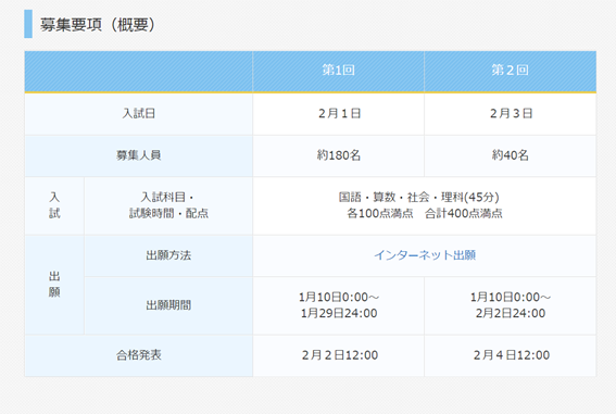 国語の試験時間は45分、100点満点であり、4教科合計の満点は400点(国語・算数・理科・社会各100点)です。2021年度入試の4教科の合格最低点は第1回が269点(67.3%)、第2回が288点(72%)。