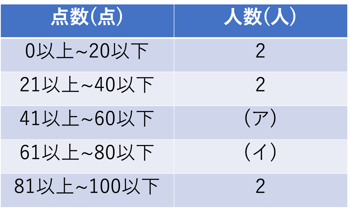 (2)上の表1を下の表2に整理したときに(ア),(イ)に入る数字を求めなさい。