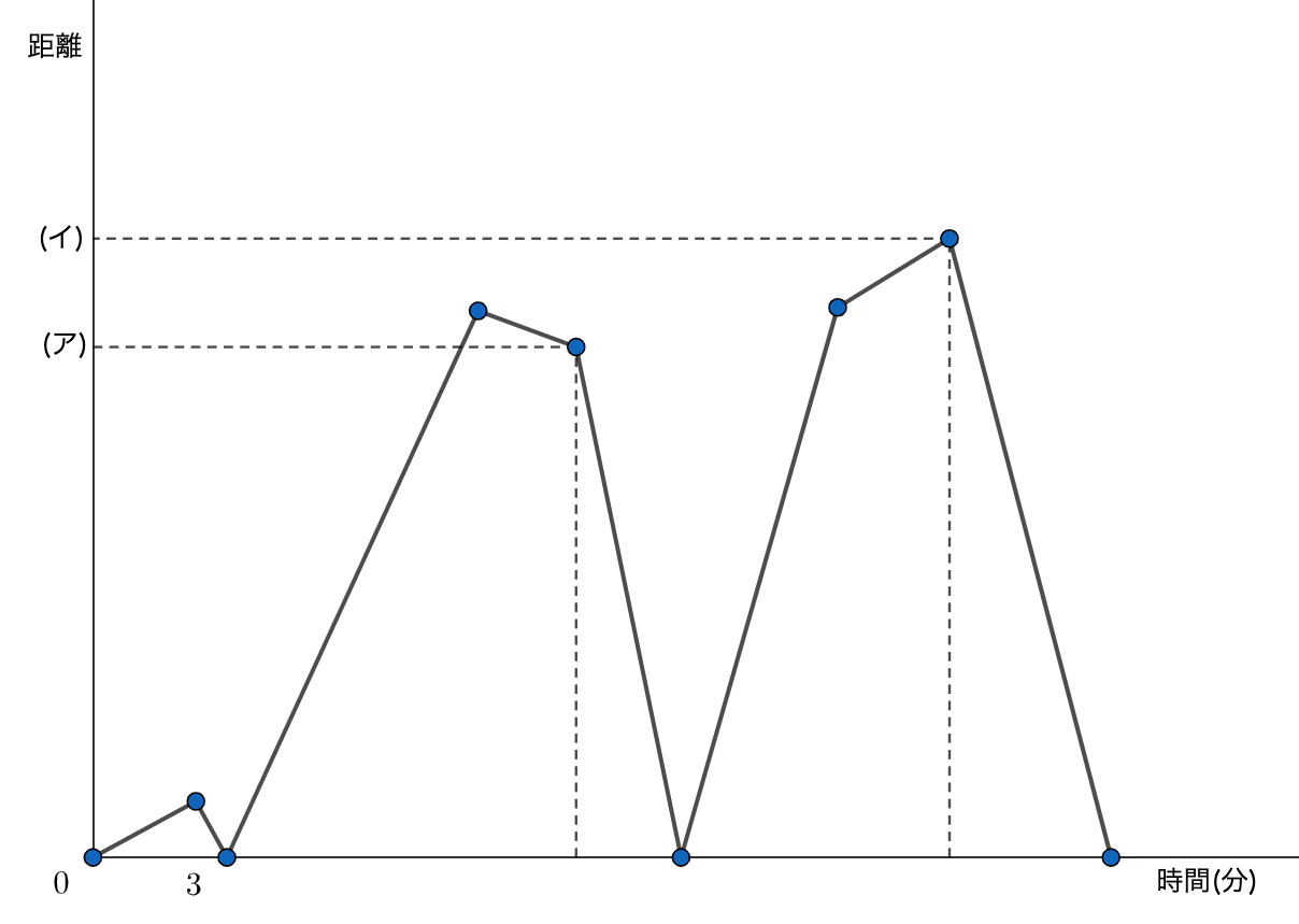 図のグラフは,A君がP駅を出発してからQ駅にたどり着くまでの時間とA君と電車との間の距離の関係を表したものです。このとき,後の問いに答えなさい。