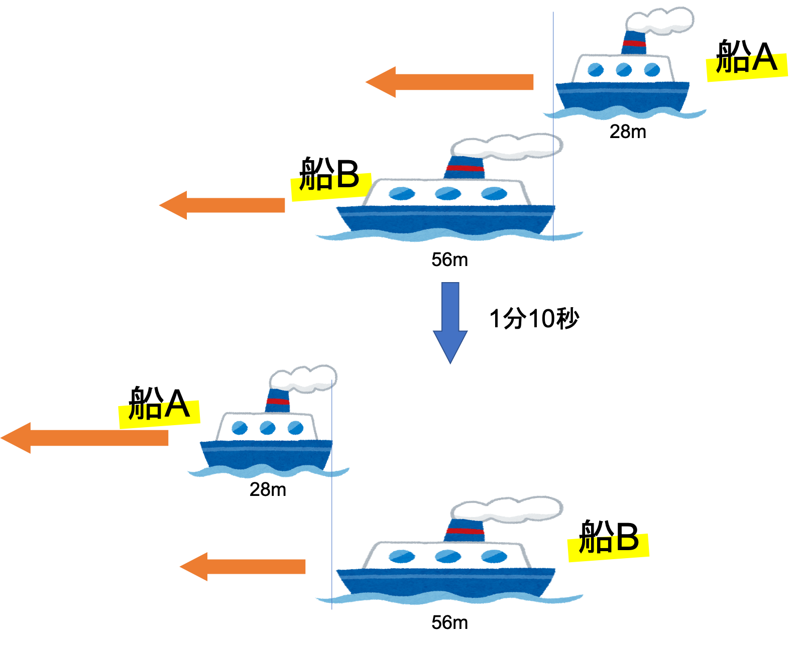 文章だけだとわかりづらいことでも,図に書き起こすと1分10秒の間に船Aが56+28=84m進んだことが明らかになりましたね。またこの84m進んだというのも,実際は船Aも船Bも川を上っているため見かけ上の距離であることもわかりやすくなりました。このように図表に問題を整理するテクニックを身につけるように励むことが攻略につながるでしょう。