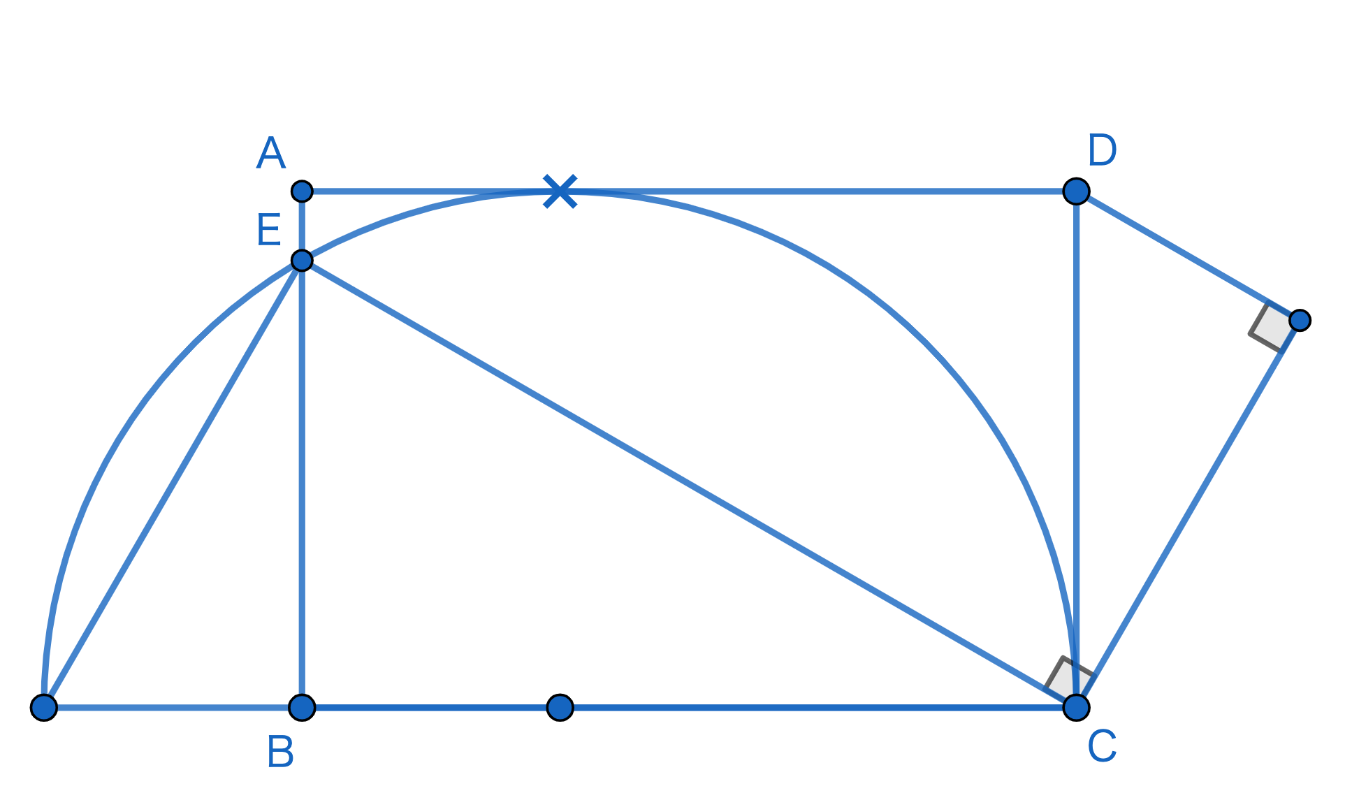 下の図において,CEの⻑さは□cm,⻑方形ABCDの面積は\(□cm^{2}\)です。このとき,図の×では半円が⻑方形の辺にぴったりくっついています。