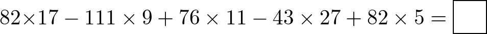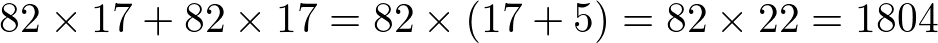 この式は,同じ数をかけて足し算するのであれば,先に足し算をしてから足し算をしてもよいということを指します。このテクニックを使うことで,かけ算の筆算が2回必要だったところが筆算1回で,場合によっては頭の中だけで計算することができるのです。例えば1問目には\(82\times17\)という式と\(82\times5\)という式がありました。この面倒な計算が因数分解を使うことですっきり整理できるのです。