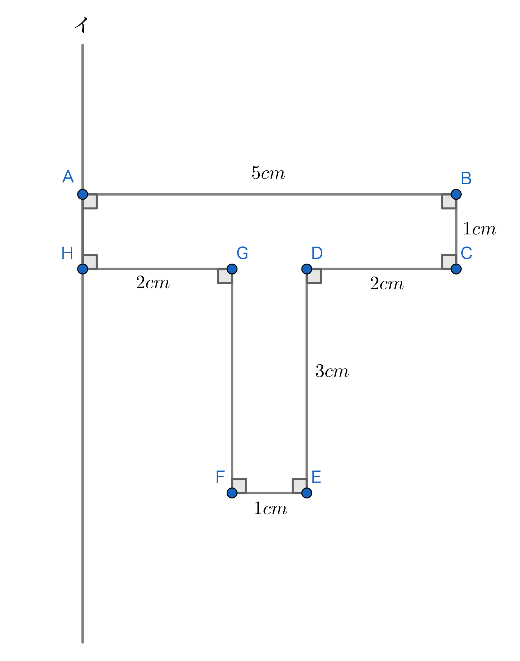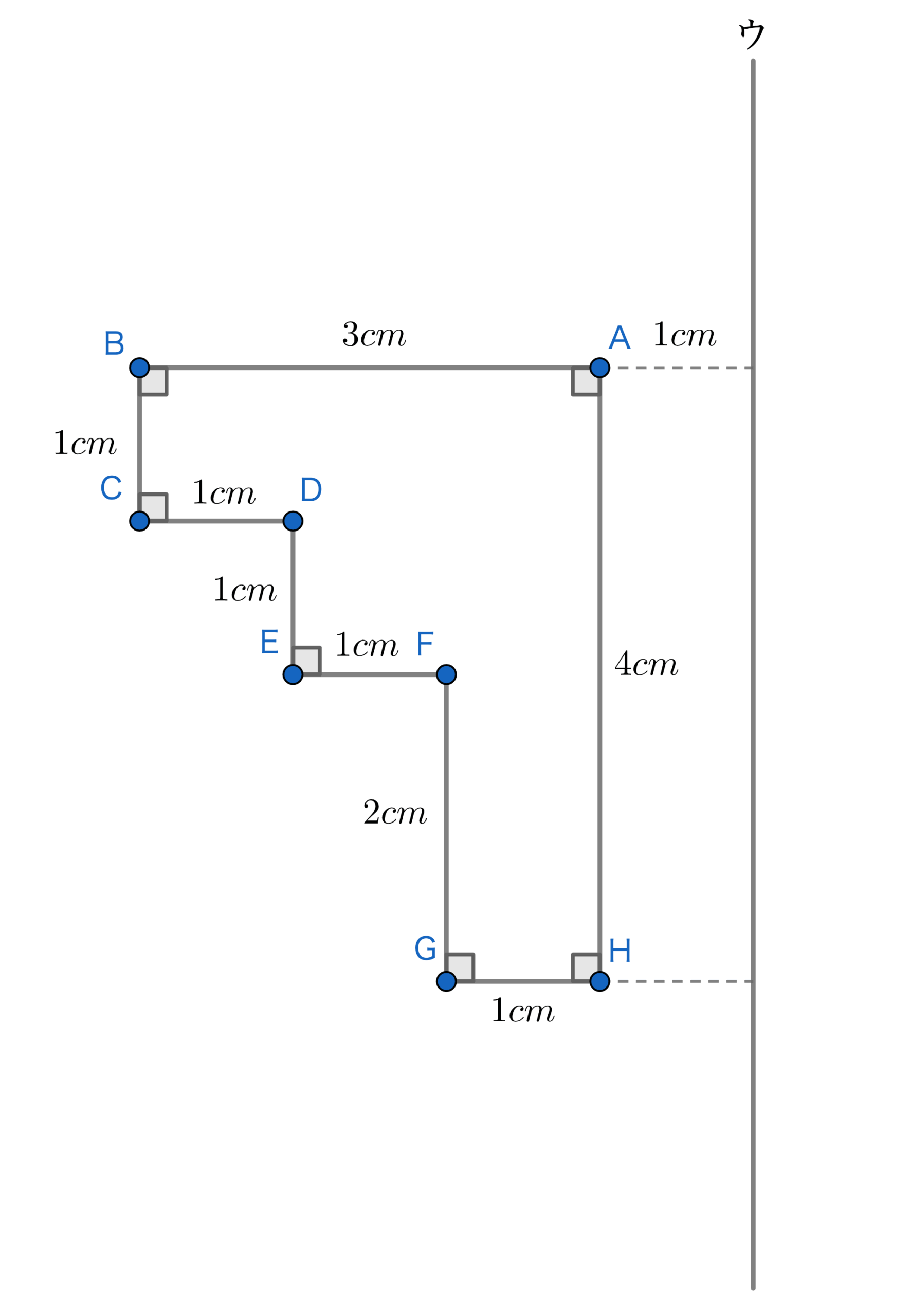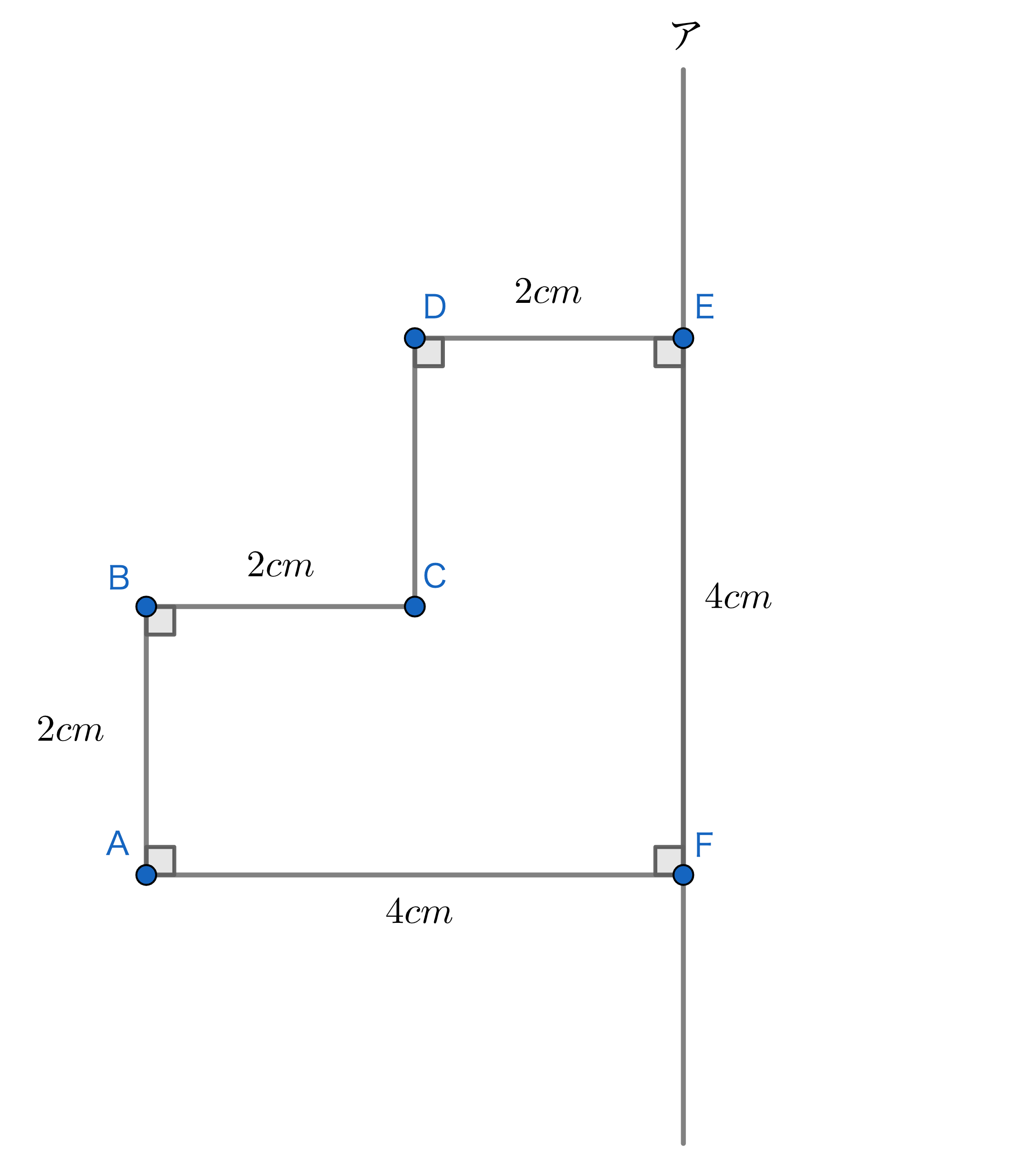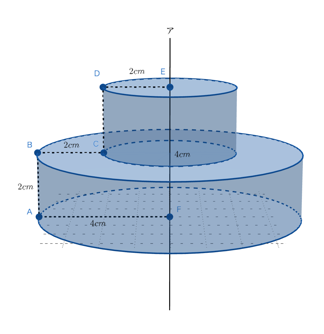 このくり抜かれた部分の有無を見分けるポイントは,回転する図形の縦に伸びる線分が軸に触れているかどうかです。今回は線分AHが軸イと触れていますが,線分GFは軸とは触れず,2cmのスキマが生まれています。そのため点H・点G・点Fが回転するときにくり抜かれた立体が出てきてしまうのです。このことを念頭に置いて以降の計算を進めましょう。