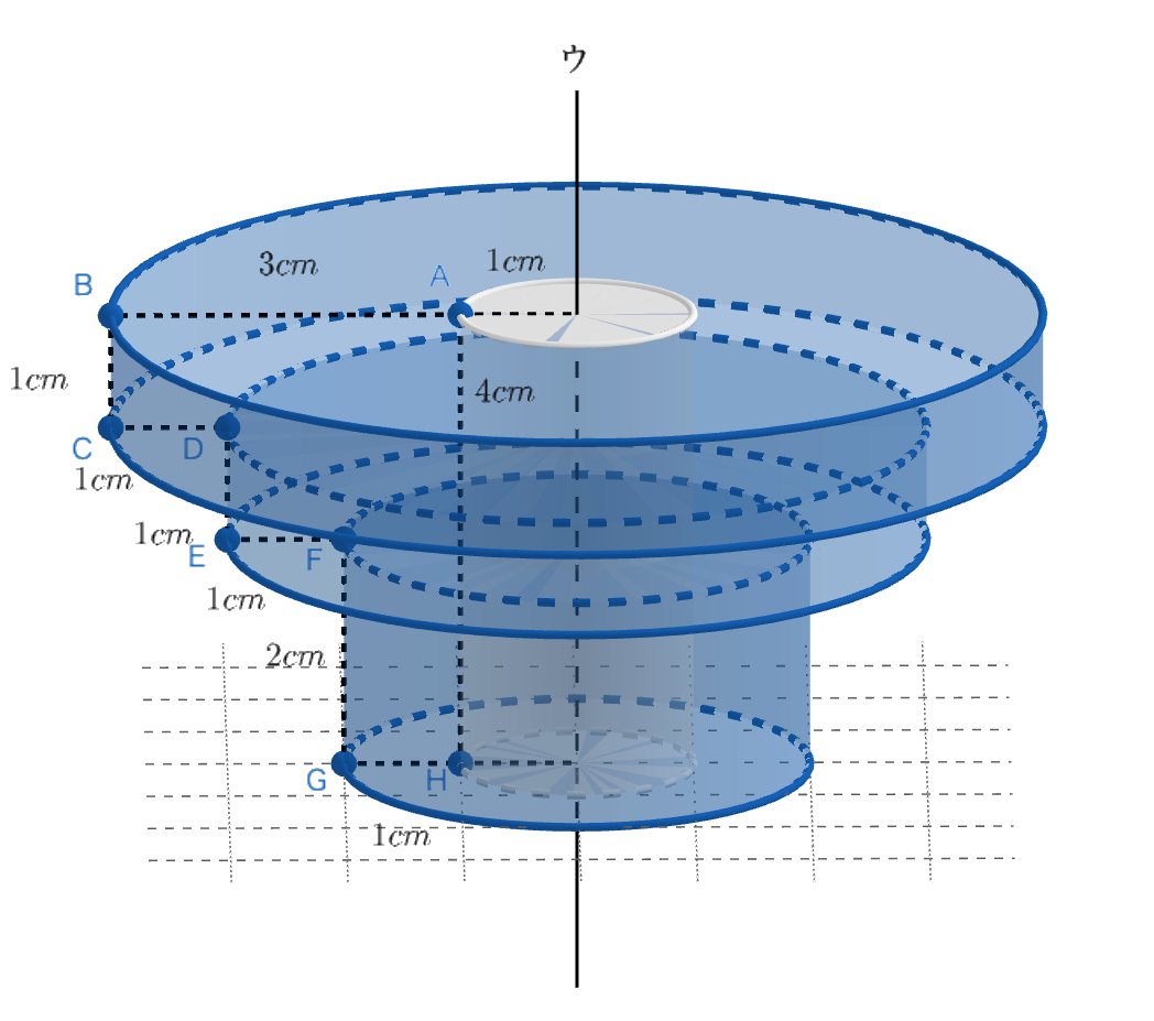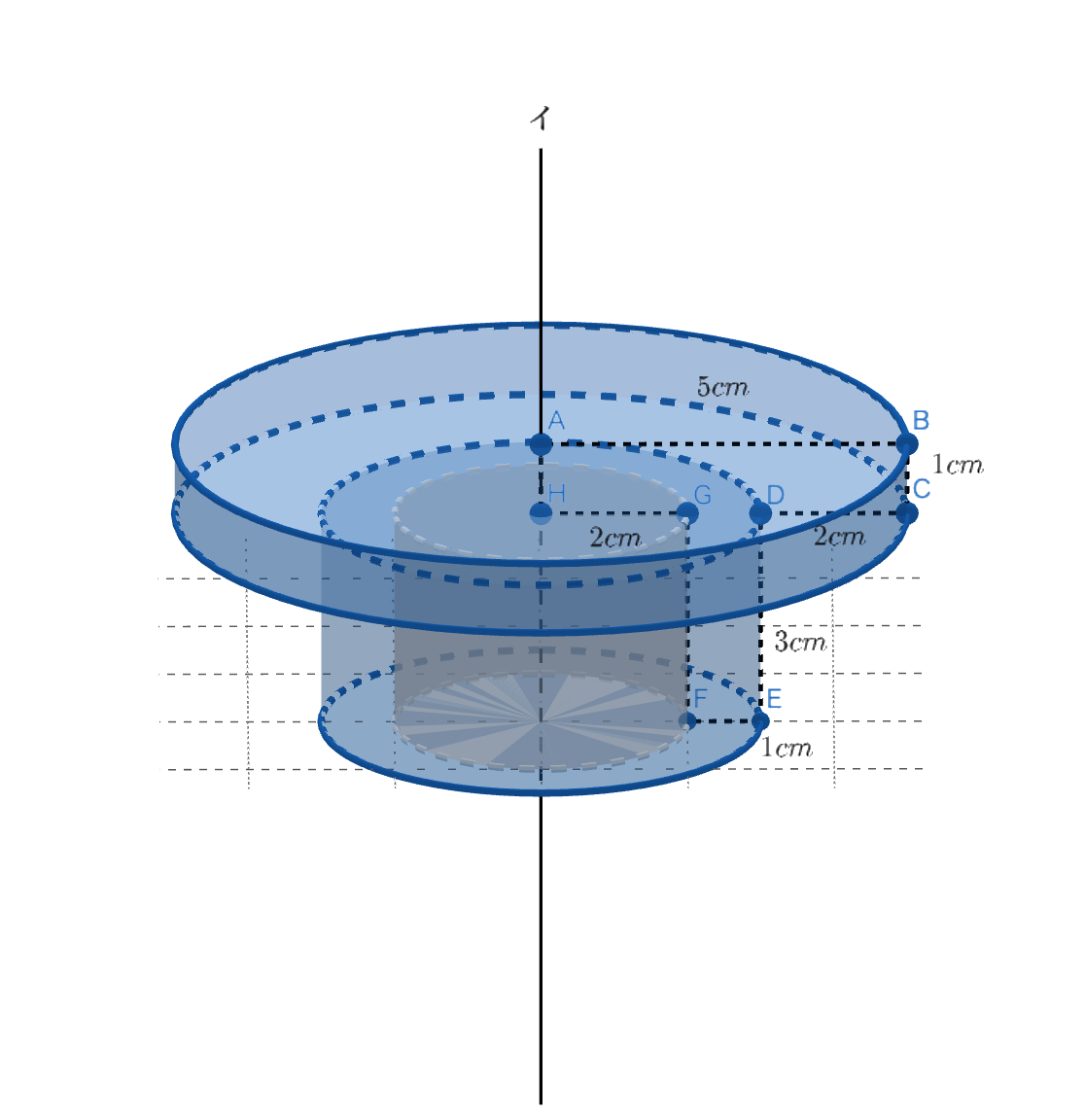 点線が元の図形,青い立体が出来上がる回転体を指しています。また真ん中に灰色のくり抜かれた部分が存在することもわかります。これは線分AH が軸ウと触れず,1cmのスキマができているからですね。①で抑えたポイントを活用していきましょう。