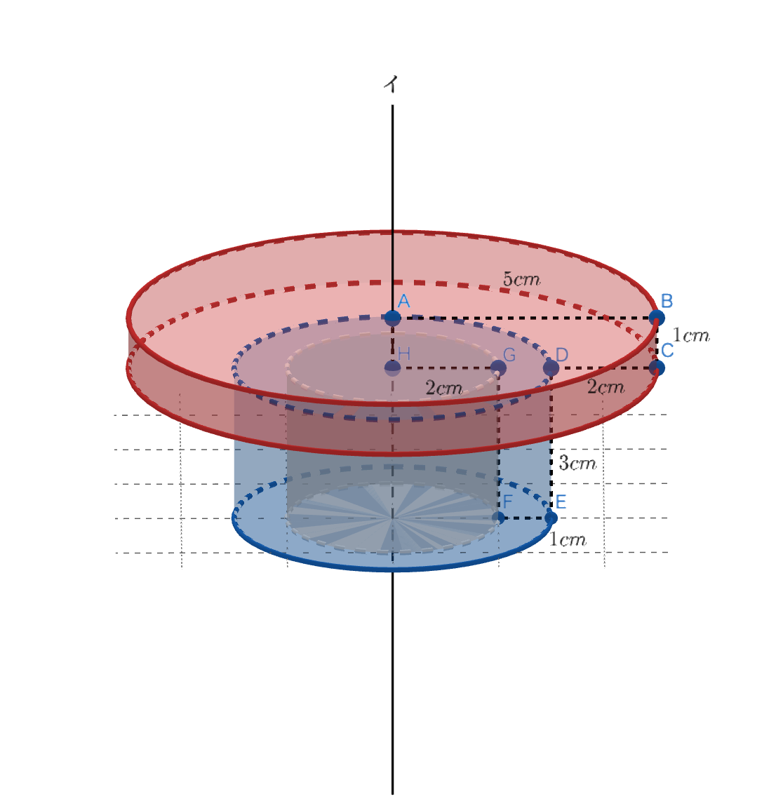 立体は赤く平べったい部分と青い縦長の部分に分けられました。これらの部分と前述した灰色のくり抜かれた部分を計算することで,回転体の体積を算出できそうです。