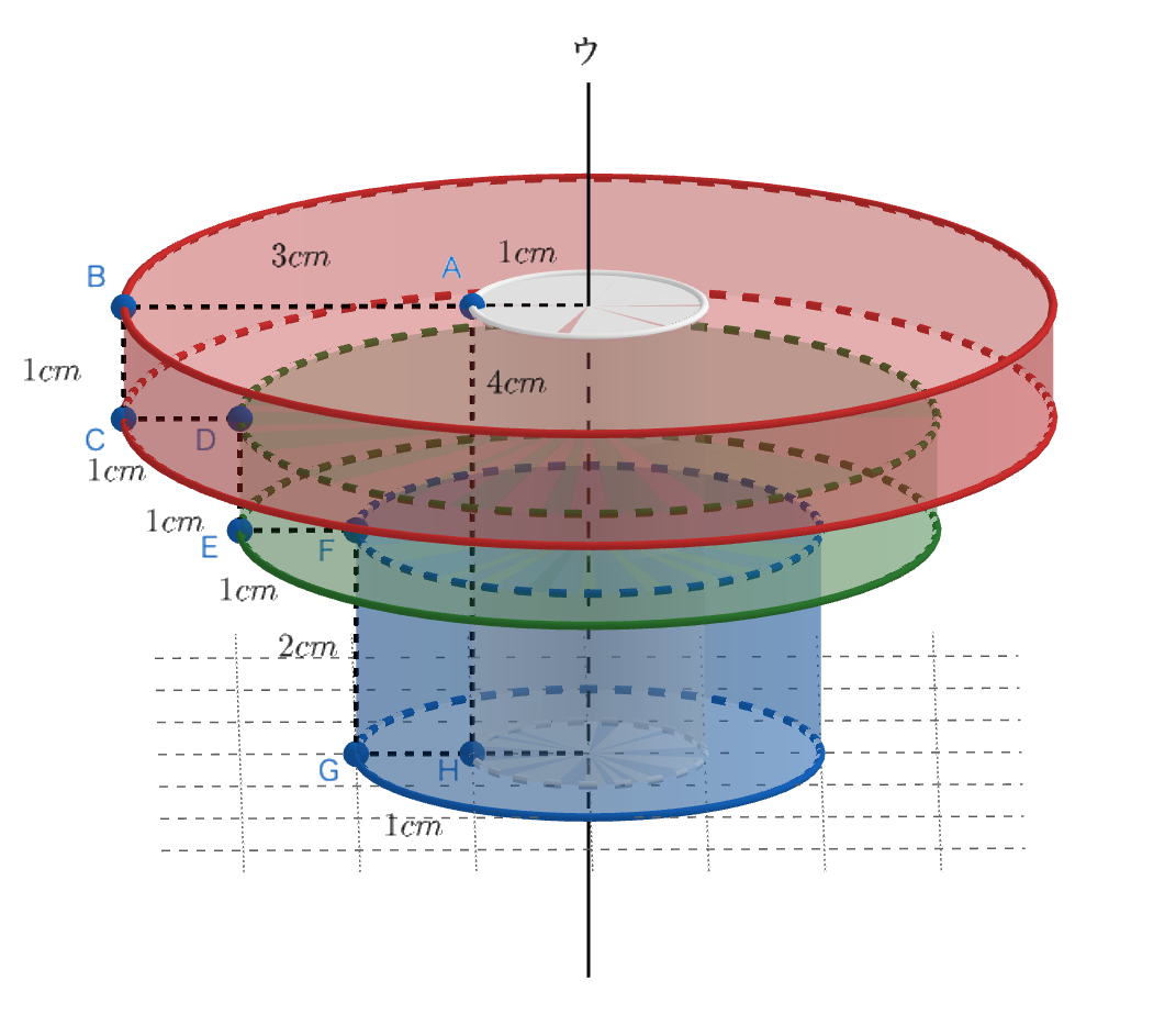 上から順に赤い円柱・緑の円柱・青い円柱の3つに分けられました。これも上で見たテクニックの通り,点D・点Fというくぼみに注目するときれいに3つに分割できます。つまりこの回転体は,赤い円柱・緑の円柱・青い円柱の体積を足し,そこから灰色のくり抜かれた部分の体積を引くことで,その体積が求められると想定されます。