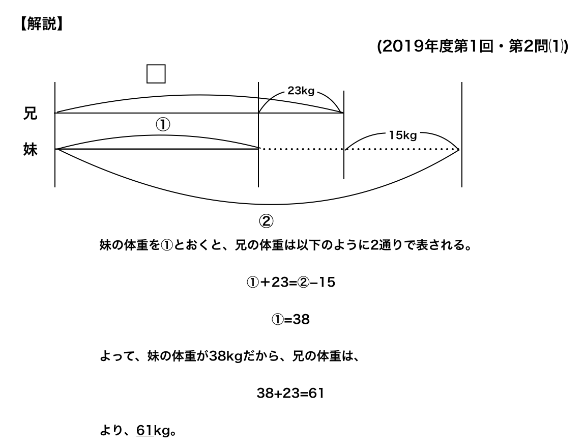 ⑴兄の体重は□ kgで、妹の体重より23kg多く、妹の体重の2倍より15kg少ないです。
