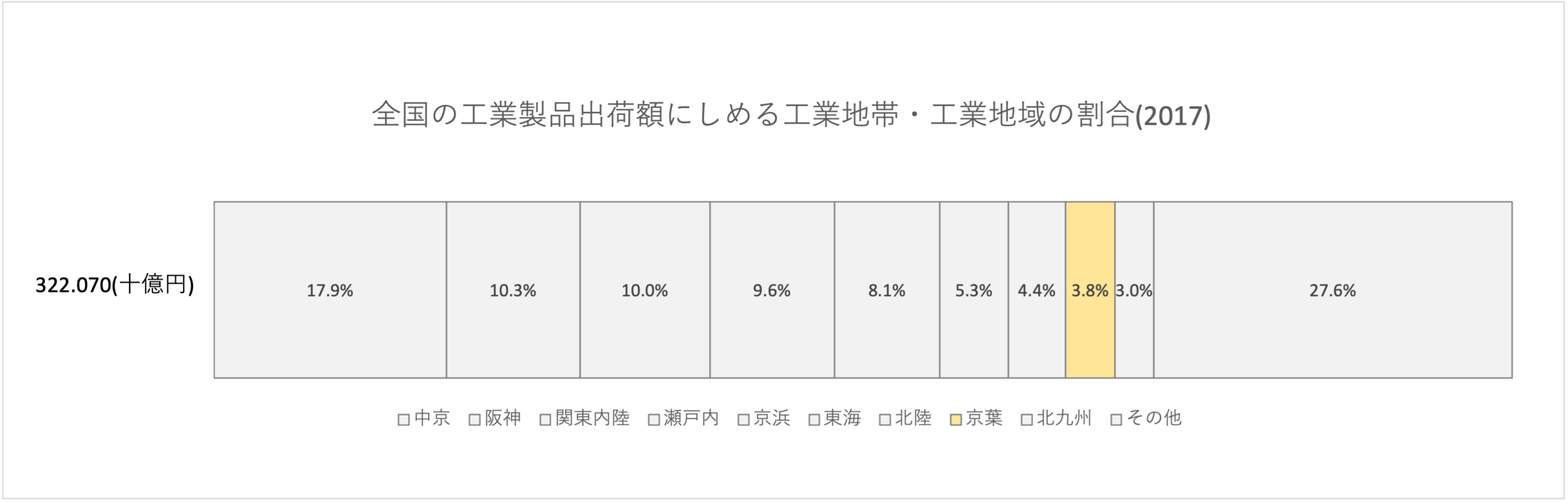 この図から,京葉工業地域は日本全国の出荷額の3.8%を占めているということがわかります。順位で言うと日本で9個工業地域・工業地帯があるうちの8番目になります。この3.8%という数字は他の工業地域・工業地帯と比べてやや見劣りしますが,それでも東京・千葉で海に面している地域という狭いエリアだけでこれだけのモノを生産している,という事実には目を見張るものがありますね。