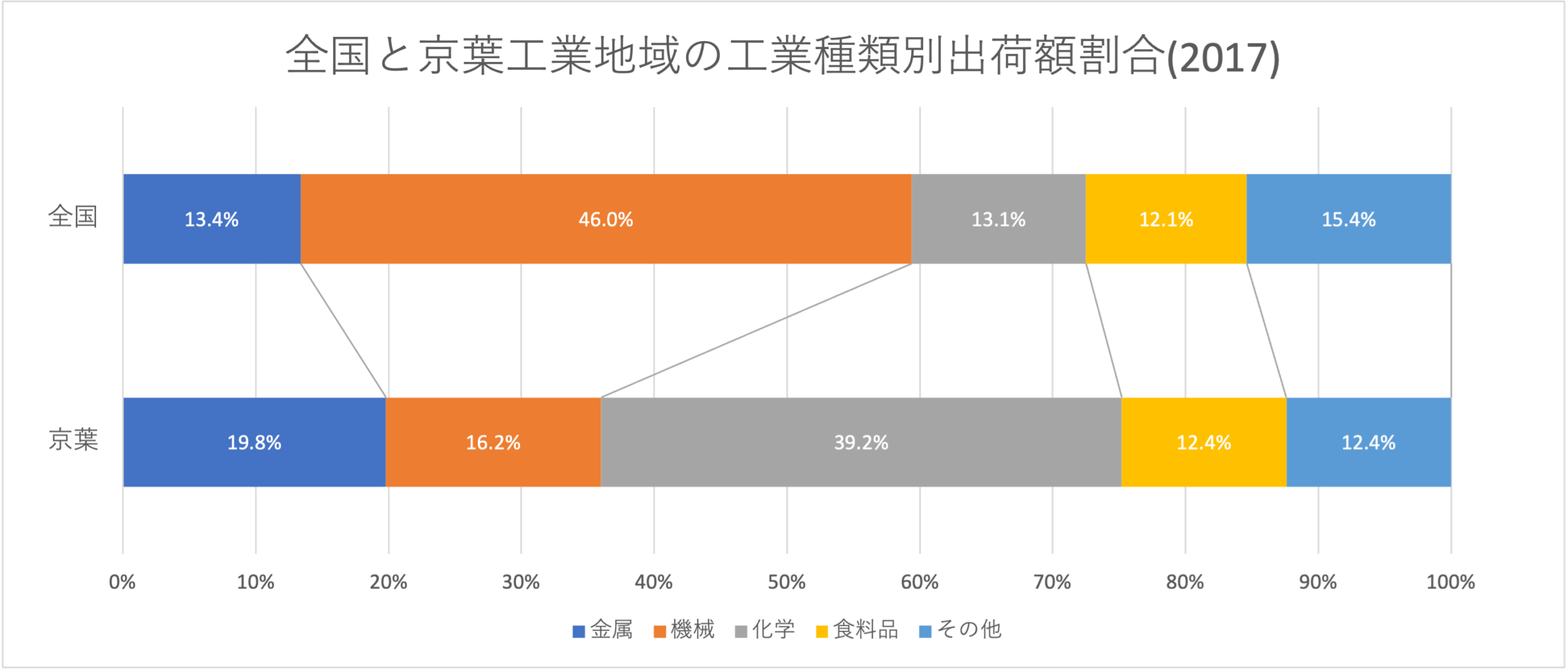 なお繊維については,京葉工業地域の生産割合のデータが見つからなかったためグラフからは割愛しました。おそらく全国平均である1%前後と大差ないと考えられます。