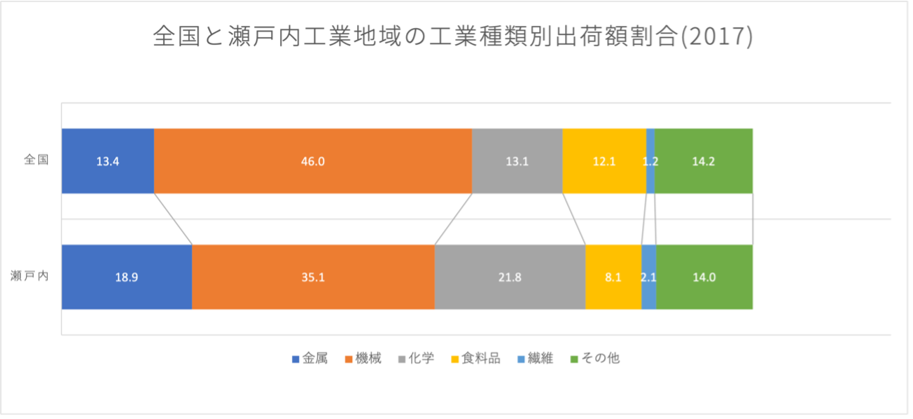 また化学や繊維産業が全体に占める割合でも違いが見られます。以前の記事でもお見せしましたが,瀬戸内工業地域の工業種類別出荷額割合をもう一度取り上げ,上でお見せした京葉工業地域のグラフと比較してみましょう。