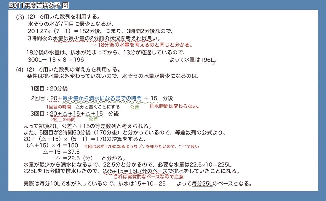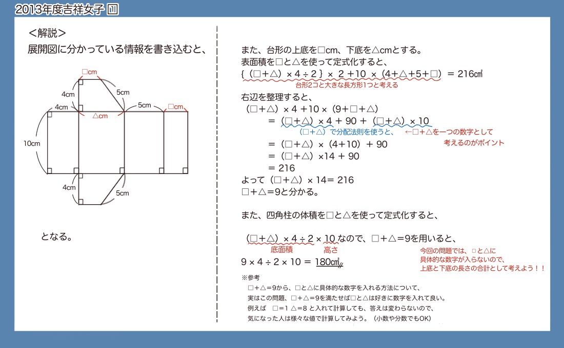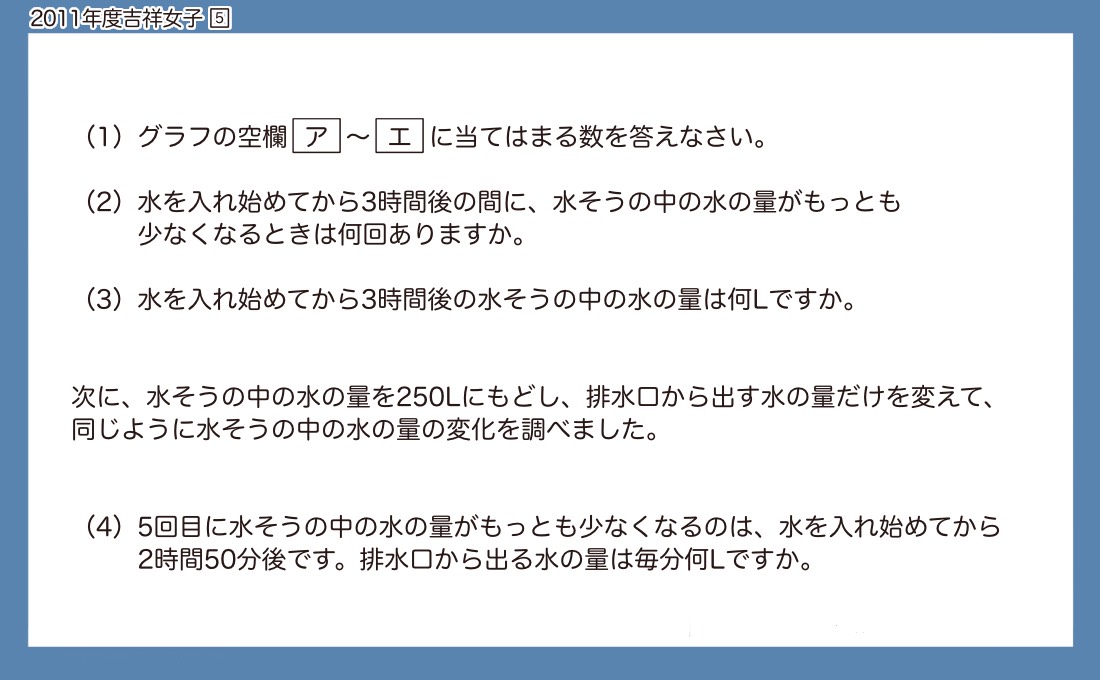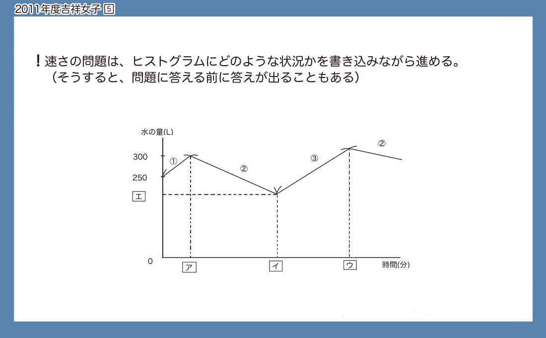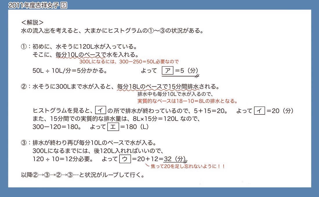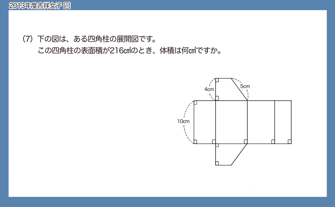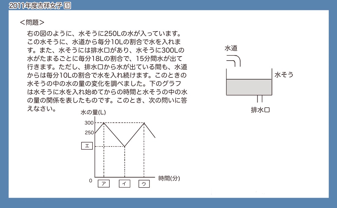 - 吉祥女子中学校の特徴として、前半と後半の問題で難易度がかなり変わってくるということが挙げられます。特に後半2題は全体的に難易度が高めです。頻出分野は速さ・図形・数の性質です。速さは旅人算などにグラフを関連づけて解く問題が特に多く出題されます。図形は回転体、平行移動や回転移動に関する問題が頻出です。回転や移動の軌跡や回転・移動後の図形の面積・体積を求めさせる問題が出題されます。