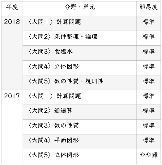 - 計算問題の次には幅広い分野から応用小問題が出題されています。特に食塩水の濃度・約束記号・割合と比・集合・場合の数・特殊算・図形や体積の求値などから出題されています。単純な計算が多く難易度が低い分、問題数は他の問題よりも多いので、素早く的確に解き進める必要があります。
