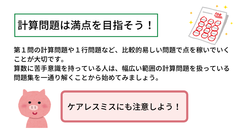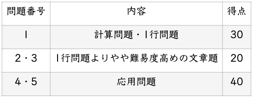大問間で難易度にかなり差があるため、比較的易しい計算問題で確実に点を稼いでいくのがよいでしょう。