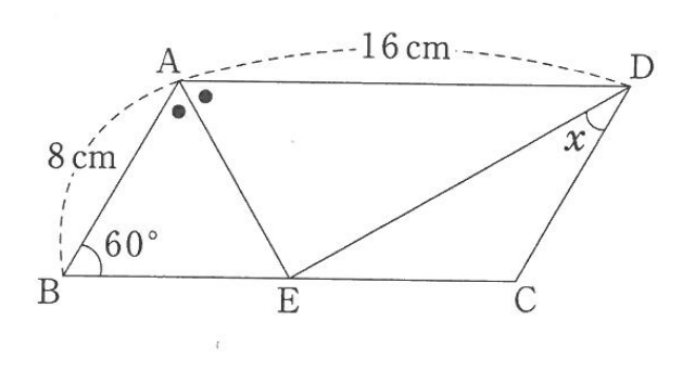 下の図で、四角形ABCDは平行四辺形です。角xの大きさは□度です。ただし、同じ印のついた角は同じ大きさとします。