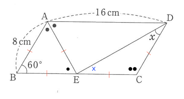 この時、△ABEは全ての角が等しいことになるので、1辺の長さが8cmの正三角形であるとわかり、●1つ分の大きさが60°、ECの長さが8cmとわかります。