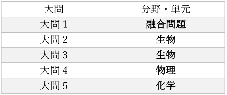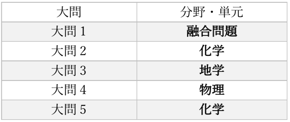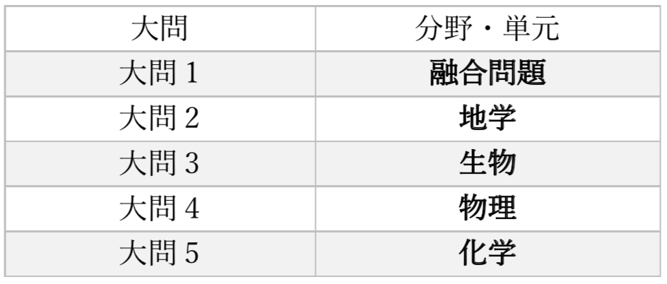 基本的には第1問が物理・化学・地学・生物の融合問題、第2問〜第5問が各分野からの出題となっている場合がほとんどです。
