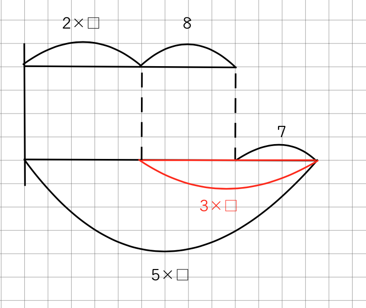 問題:子どもにあめを配るのに、1人に2個ずつ配ると8個余り、1人に5個ずつ配ると7個足りません。子どもは何人いますか。