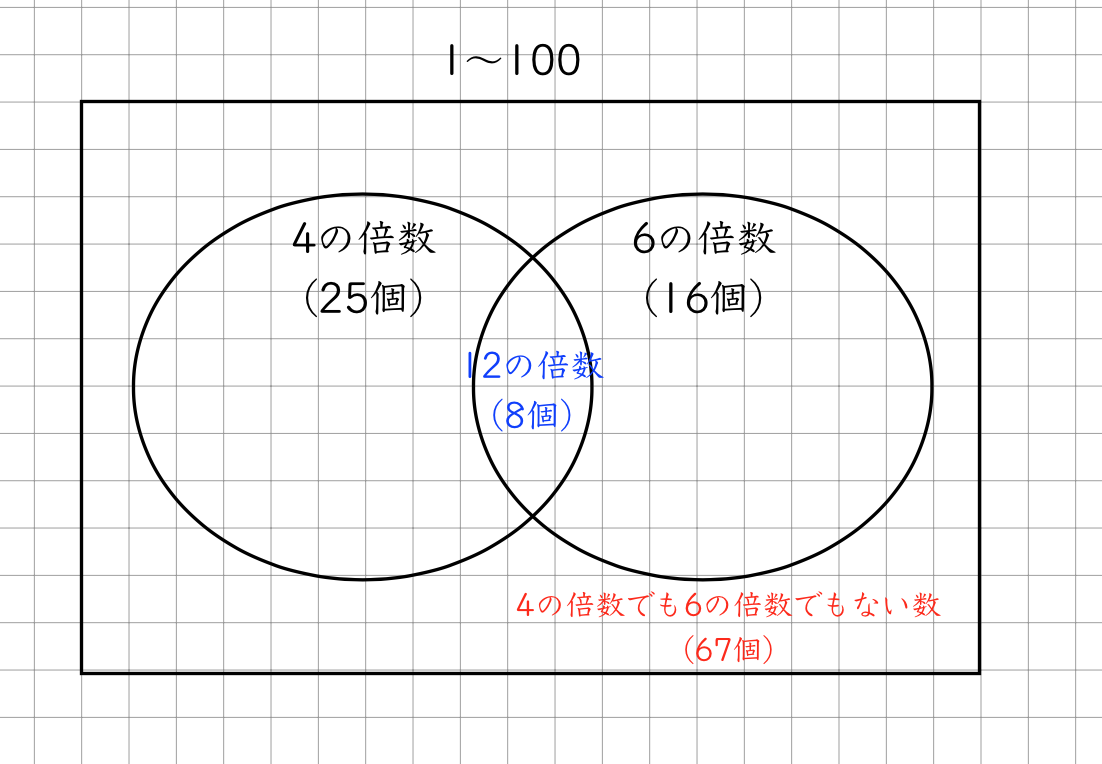 問題:1から100までの100個の整数の中で、4でも6でも割り切れない整数は全部で何個ありますか。