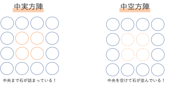 それではまず前回の記事でご紹介した内容を振り返っていきましょう。そもそも方陣算とは石やおはじきなどを特定の形に合わせて並べていくときの文章題を指しました。このときの配置によって問題の中身がいくつかに分類できるのですが,その中でも基礎編では四角形の方陣,とくに中身の詰まった中実方陣・中身の抜かれた中空方陣の性質についてご紹介していきました。
