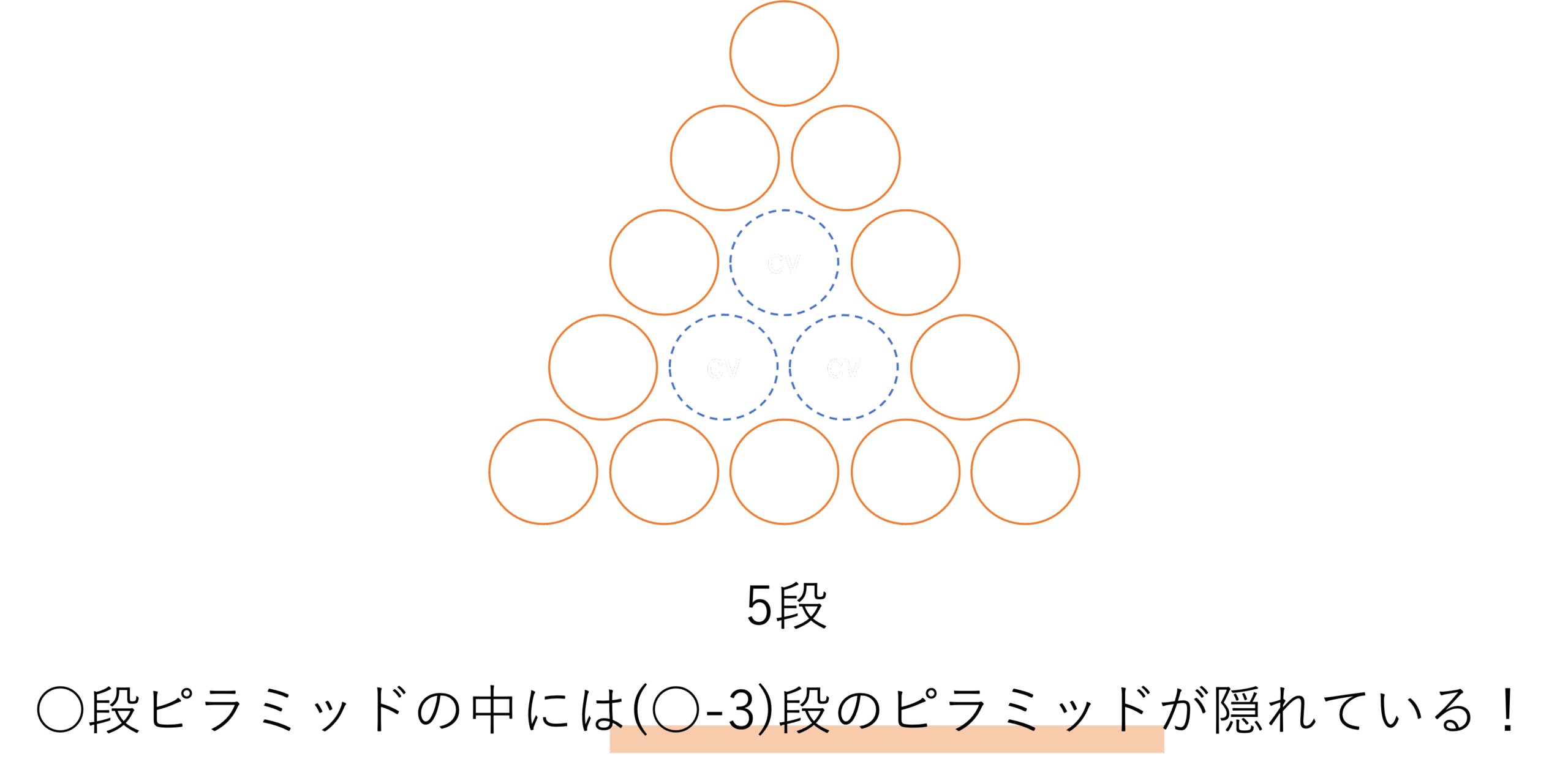 そしてこのように4段の中に1段,5段の中に2段,……と考えていくと,○段の中には(○-3)段のピラミッドが存在していると考えられますね。このことから外周の数は次のように定義することができます。「図を書かないと探しづらい,でも図を書くには面倒」という厄介な問題なので,この機会に計算式を頭に入れてしまいましょう。