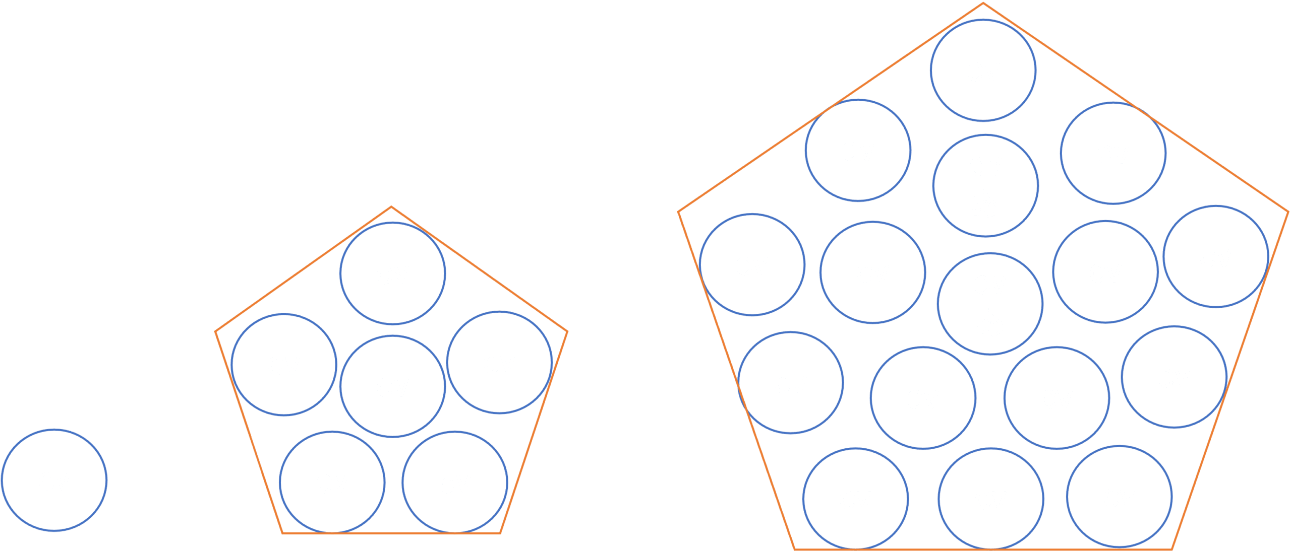 まず全体の数ですが,その前に五角形の方陣算の全体像をわかりやすくするために,三角形の場合と同様に1辺の数が1個のとき,2個のとき,……と数字を増やしながら五角形の方陣を作っていきましょう。図のようなイメージが登場したら,ここからご紹介する公式や関係が使えると思っていただければ幸いです。