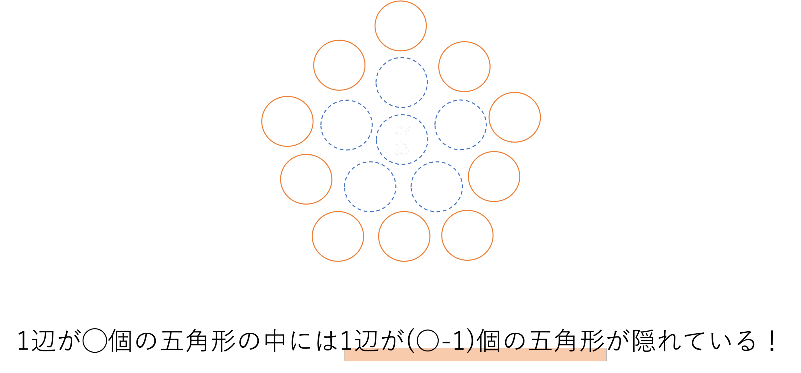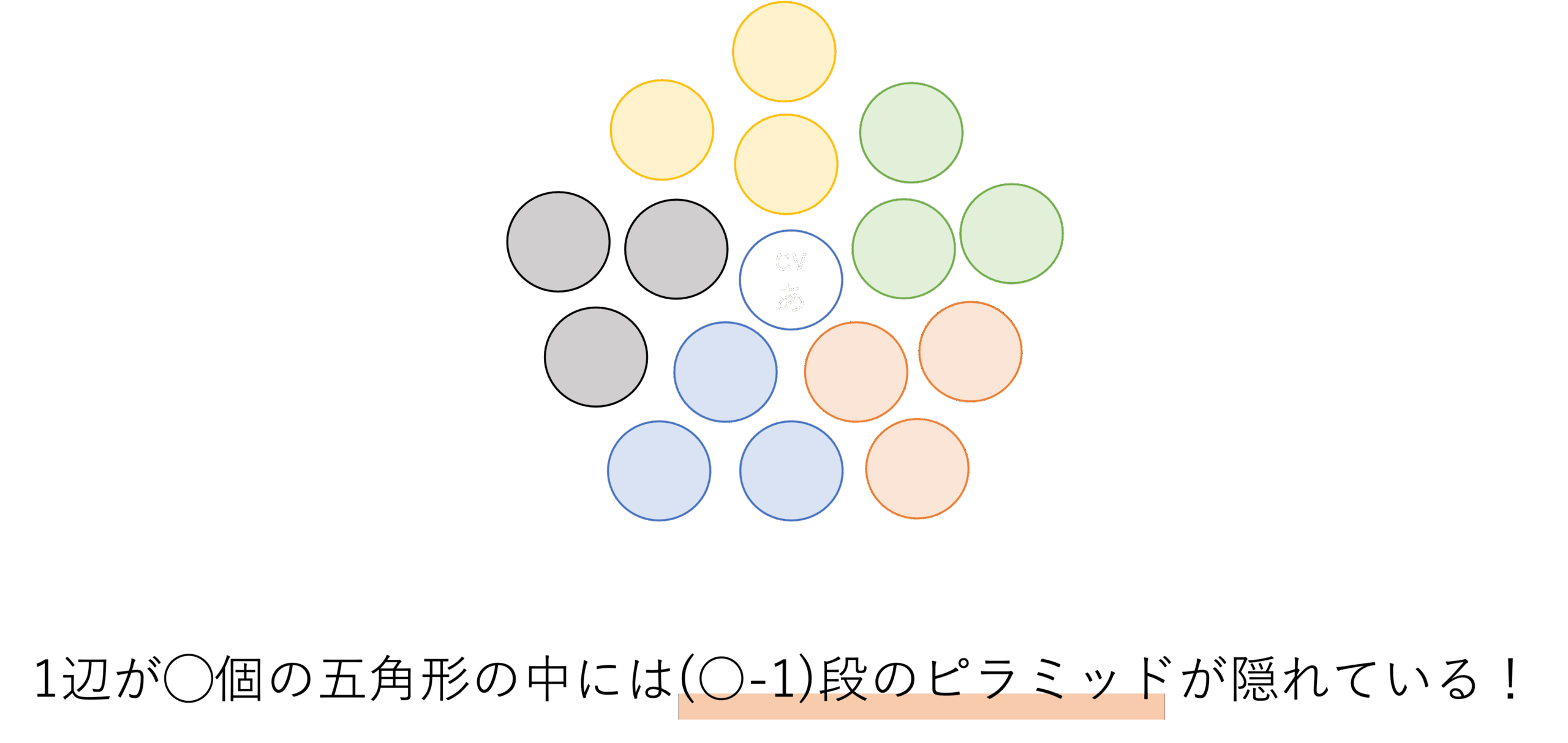 1辺が○個の五角形の全体の数=5×(○-1)段のピラミッドの全体の数+1