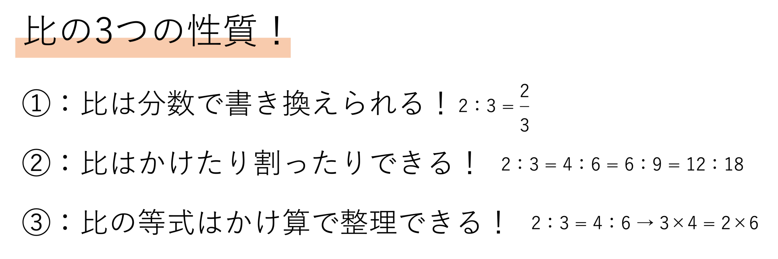 まずは前回の記事で取り扱った比の3つの性質を思い出しておきましょう。比とは,割合と同じように,あるモノとあるモノの比率を表したものです。1つの数を基準とする割合と違って,2つの数の大きさをそのまま関係として整理したものが比の正体になります。