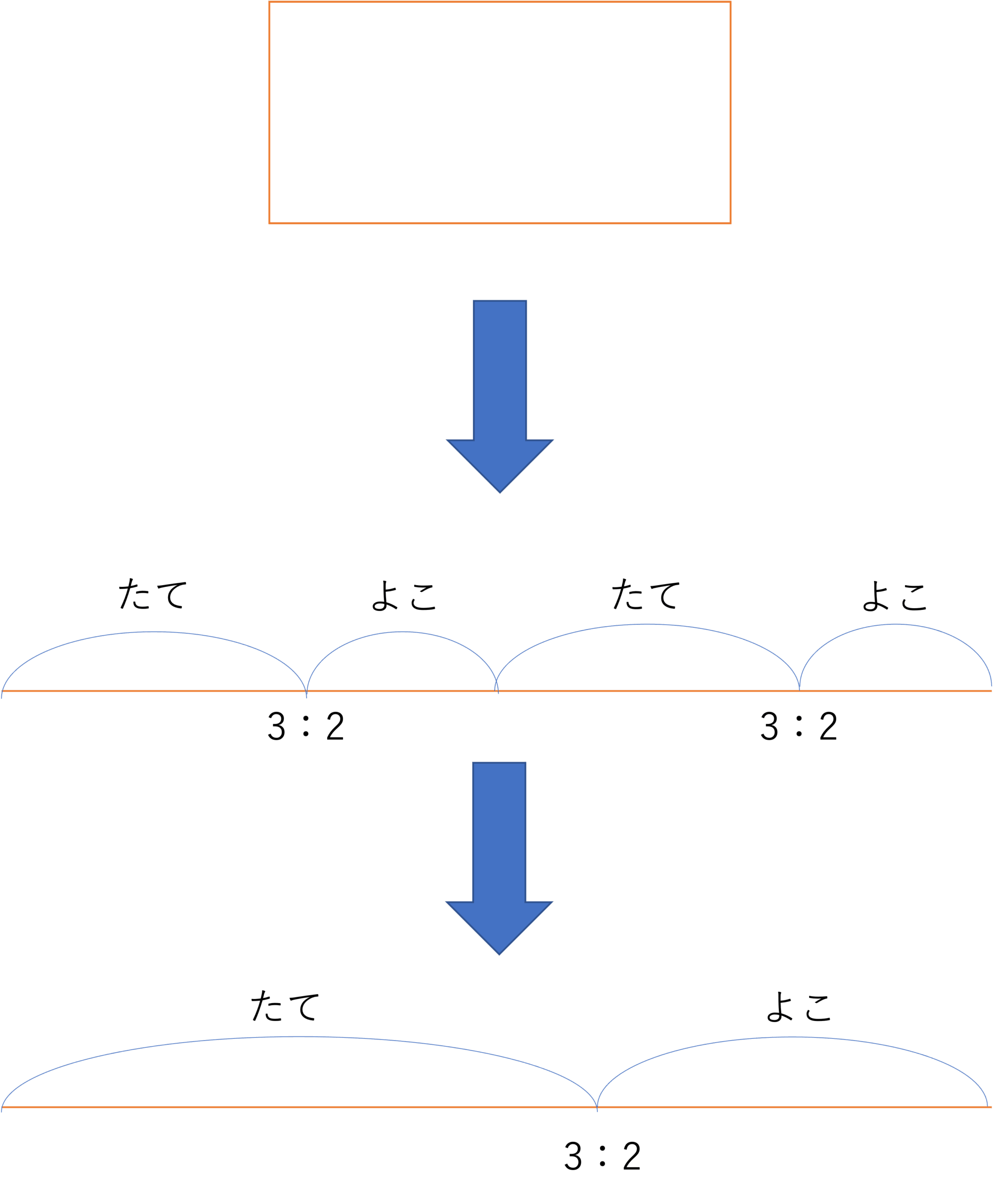 次に今回の問題の条件について眺めていきましょう。今回は針金を長方形にする,という問題でした。これをひも解くと,針金はたて―よこ―たて―よこの4つの分割されることが分かります。そしてこの分け方において長方形のどの部分に相当するかを考えると,たてとたて・よことよこが等しいことから,針金を3:2で分けるということと同じ意味になります。このことから,たての長さに使う針金とよこの長さに使う針金の比は3:2になり,□cmの中身はその半分になるというわけです。