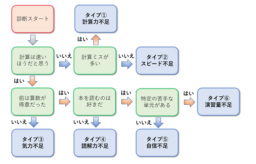 いかがでしたでしょうか。簡易的なタイプ別診断ですので、必ずしも全ての人に正確に当てはまるものではないですが、自身の長年の指導経験から、算数が苦手となってしまう場合の傾向と対策を考えたものです。