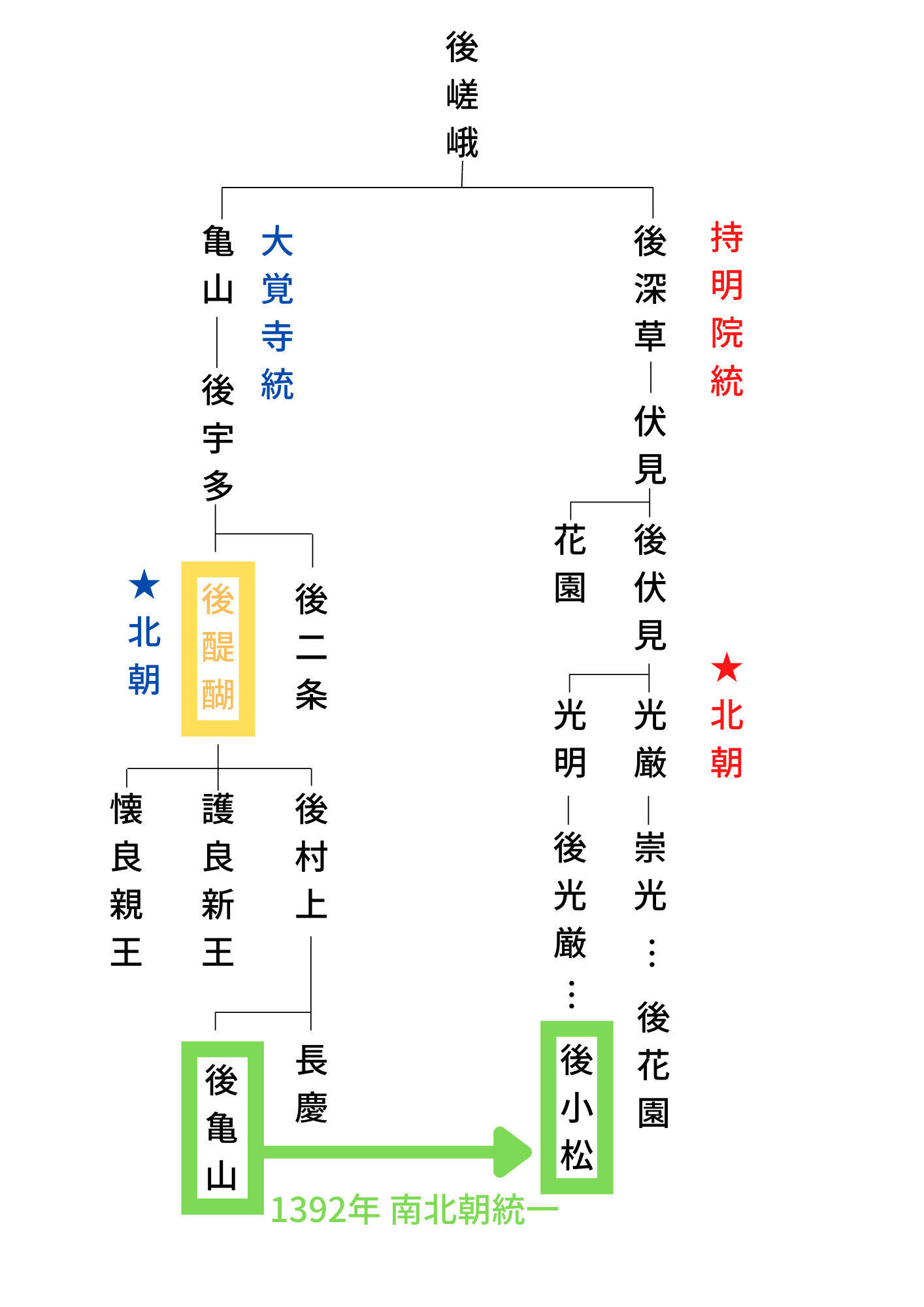 鎌倉末期、後嵯峨上皇は後継者を指名せずに死去します。皇統は後深草上皇の流れをくむ持明院統と、亀山上皇の流れをくむ大覚寺統に分裂しました。両統は鎌倉幕府に工作し、自分の統から次の天皇を出そうとします。それに対し鎌倉幕府は両統が交互に即位する両統迭立を推奨しました。