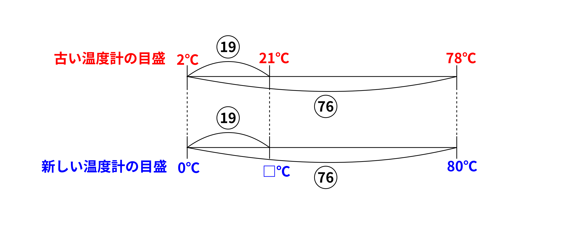求めたいのは、古い温度計が示す\(21\,{}^\circ\mathrm{C}\)が、新しい温度計の何\(\,{}^\circ\mathrm{C}\)にあたるかです。この温度を□\(\,{}^\circ\mathrm{C}\)とすると、