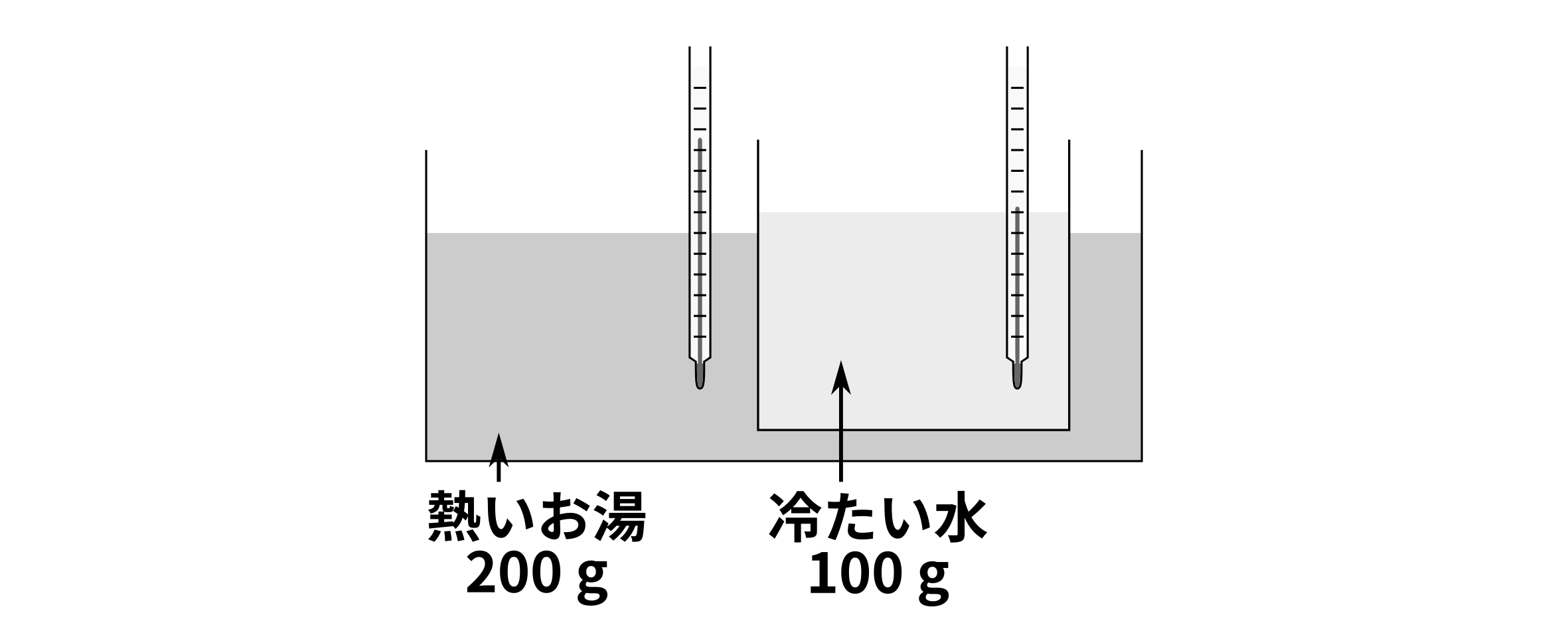図1のように、熱いお湯\(200\,\mathrm{g}\)が中に入った大きなビーカーの中に、冷たい水\(100\,\mathrm{g}\)が中に入った小さなビーカーを入れます。大きなビーカーの中に小さなビーカーを入れてから、このお湯と冷水の温度変化を調べました。このとき、次の問いに答えなさい。ただし、大きなビーカーは発泡スチロールのような断熱材でおおわれており、熱の移動はビーカーの間でしか起こらないものとします。